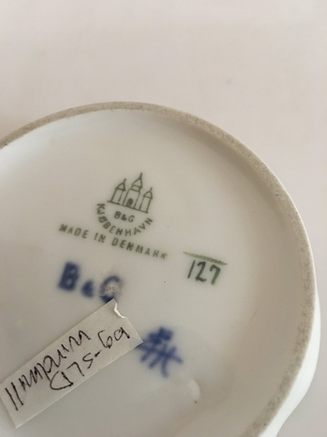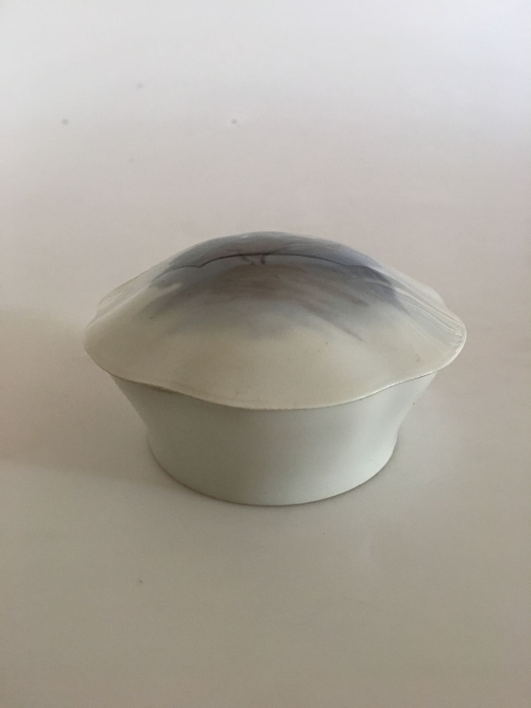 Bing & Grøndahl Lidded Bowl No. 127 with Old Mill Decoration. 5.5 cm H with lid on (2 11/64"). 10 cm dia (3 15/16"). 1st Quality from 1902-1914. In good whole condition