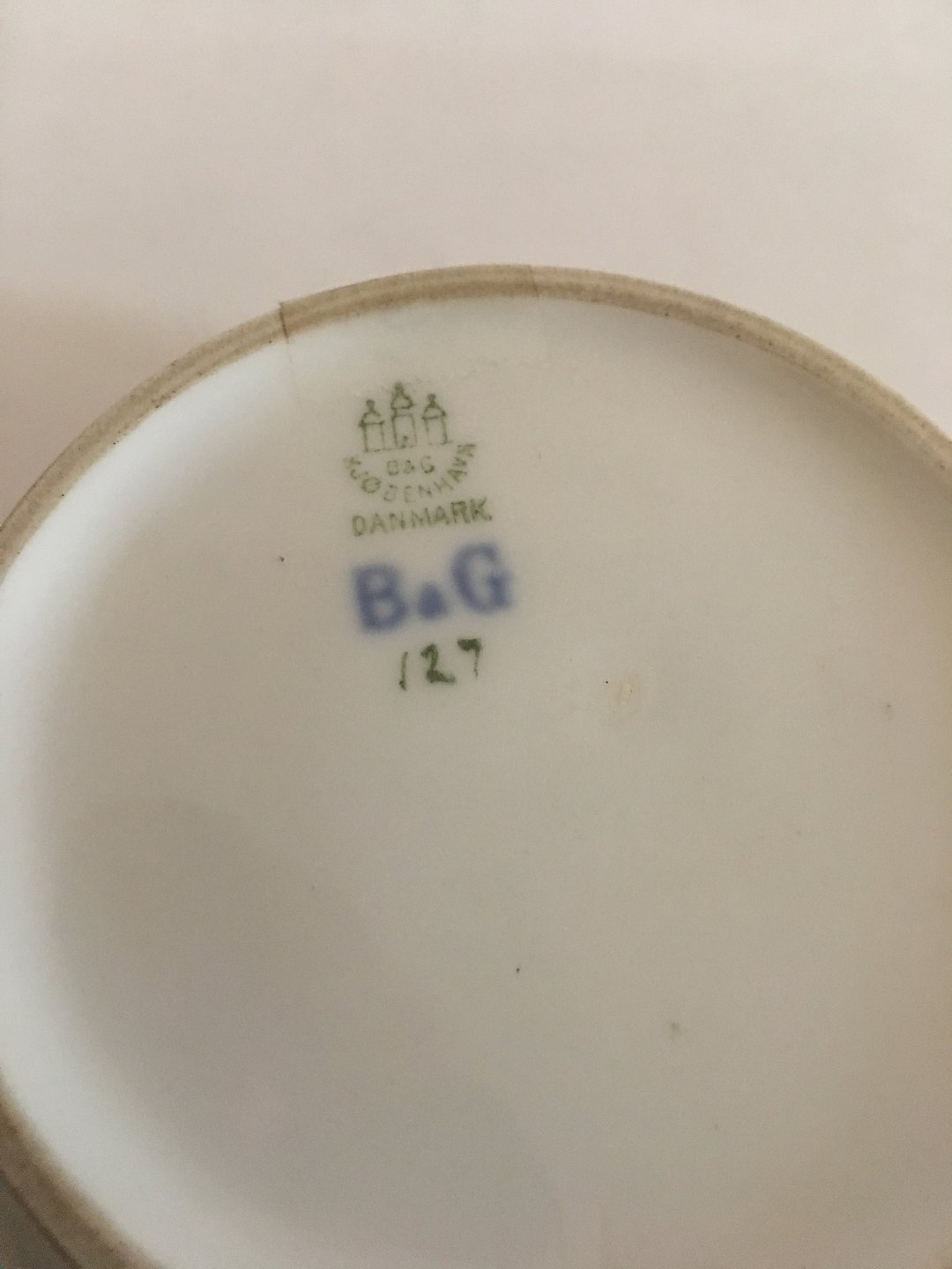Bing & Grøndahl Lidded Bowl No. 127 with Boat Decoration. 5.5 cm H with lid on (2 11/64"). 10 cm dia (3 15/16"). 1st Quality from 1915-1947. In nice whole condition