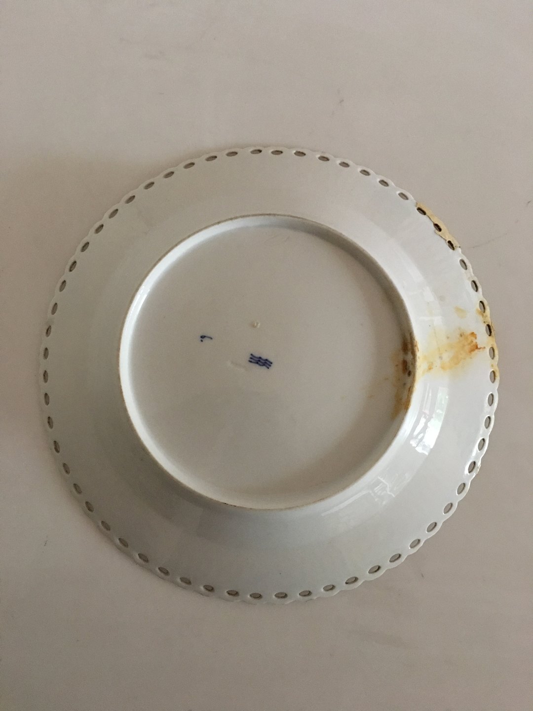 Royal Copenhagen Antique Blue Fluted Full Lace Plate. 23.5 cm dia. / 9 1/4 in. Chipped and repaired on a larger part of the lace rim.