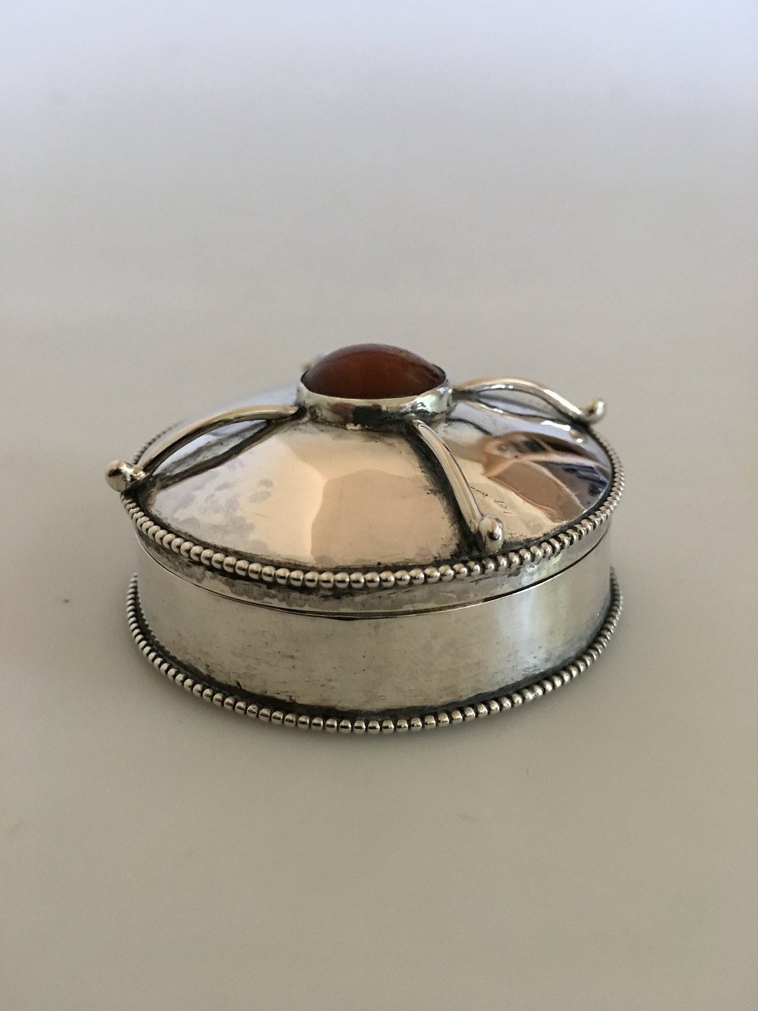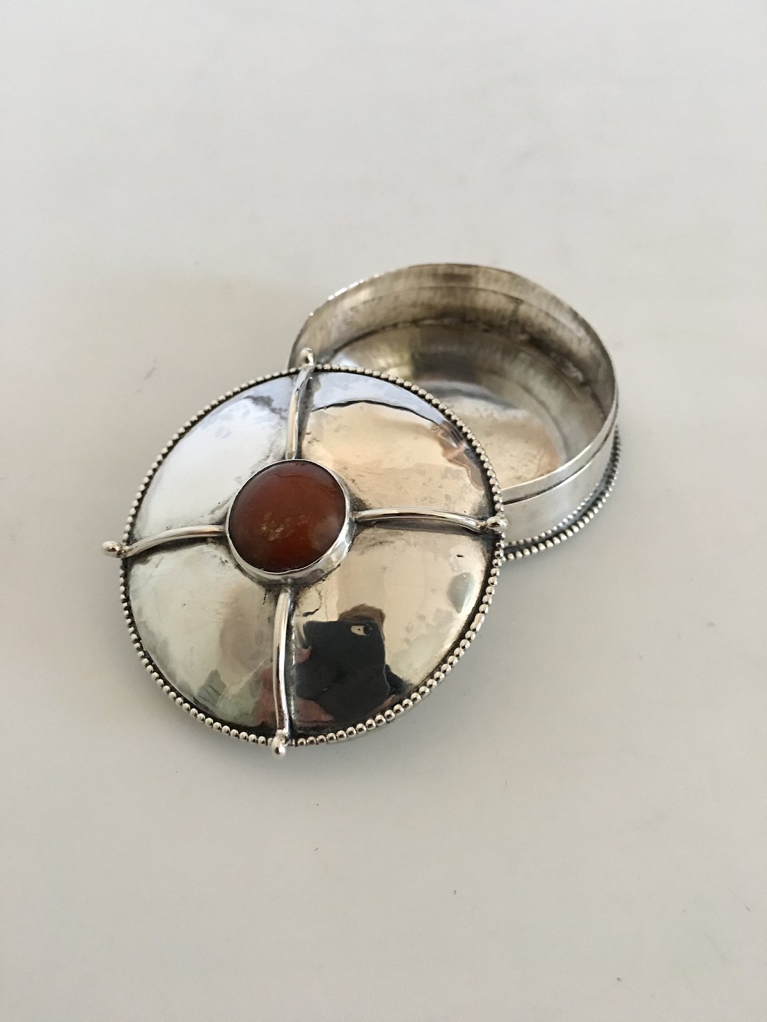 Christian Fjerdingstad Pill Box in 826 Silver ornamented with an Amber Stone. Measures 2.2 cm H (0 55/64"). 5.5 cm diameter (2 11/64"). Weighs 32 grams. The amber stone has a small scratch.