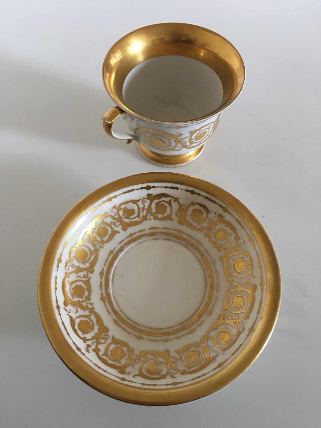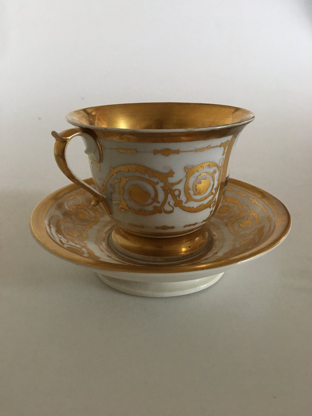 Royal Copenhagen Antique Morning Cup with handpainted motif of Borsen (exchange) and Holmens Church. In good condition and intact. The handpainted motif is with out scrathes. Light gold wear. Cup measures 9 cm / 3 1/2" high. 11,5cm / 4 1/2" dia. Saucer measures 17cm / 6 7/9".