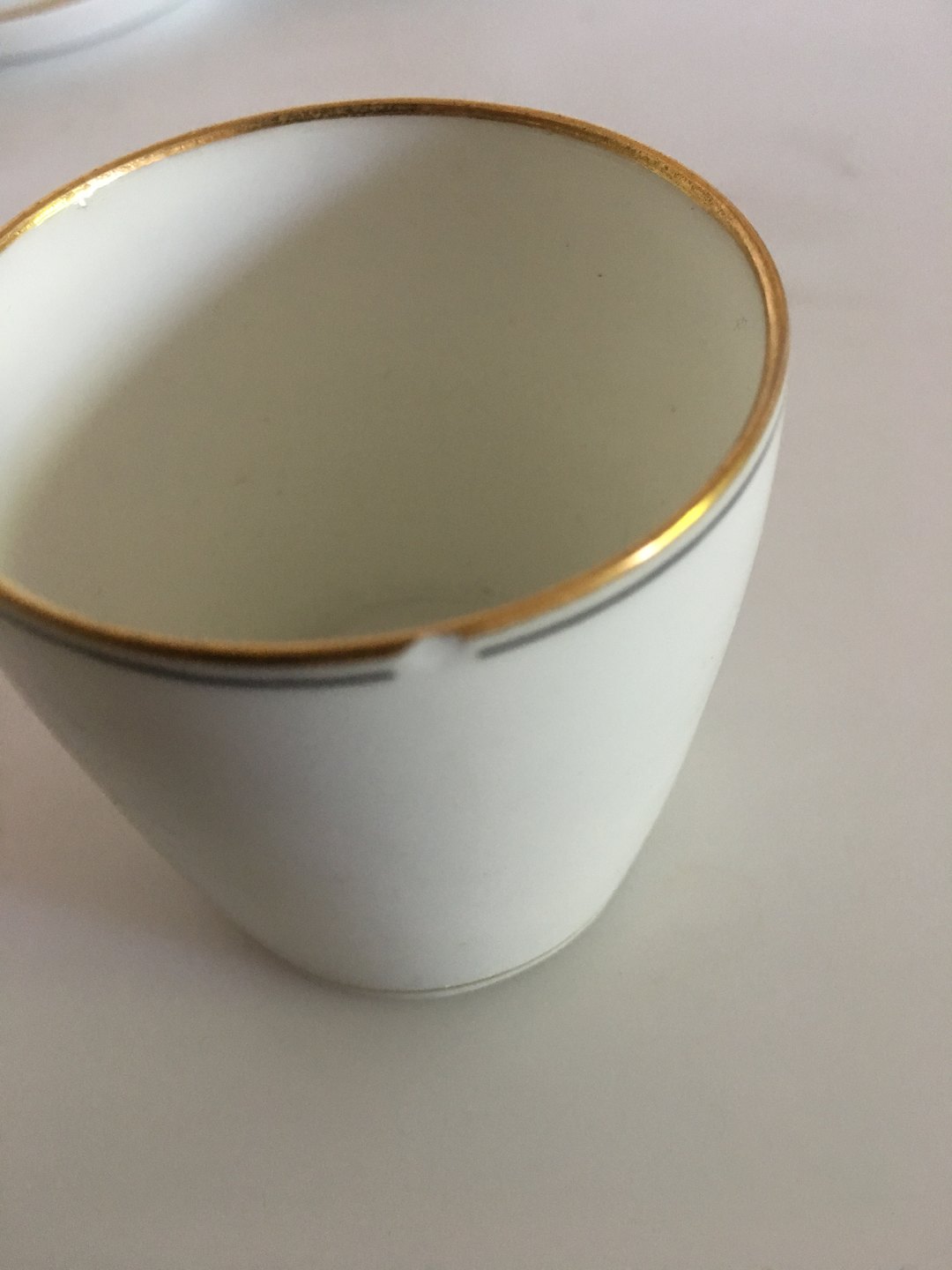 Bing & Grondahl Mocha Set, with tray, Jug, Creamer, Two Cups and Sugar Bowl. In nice condition, with only minimal wear on the gold. The mocha jug measures 12 cm H. With old B&G Stamps