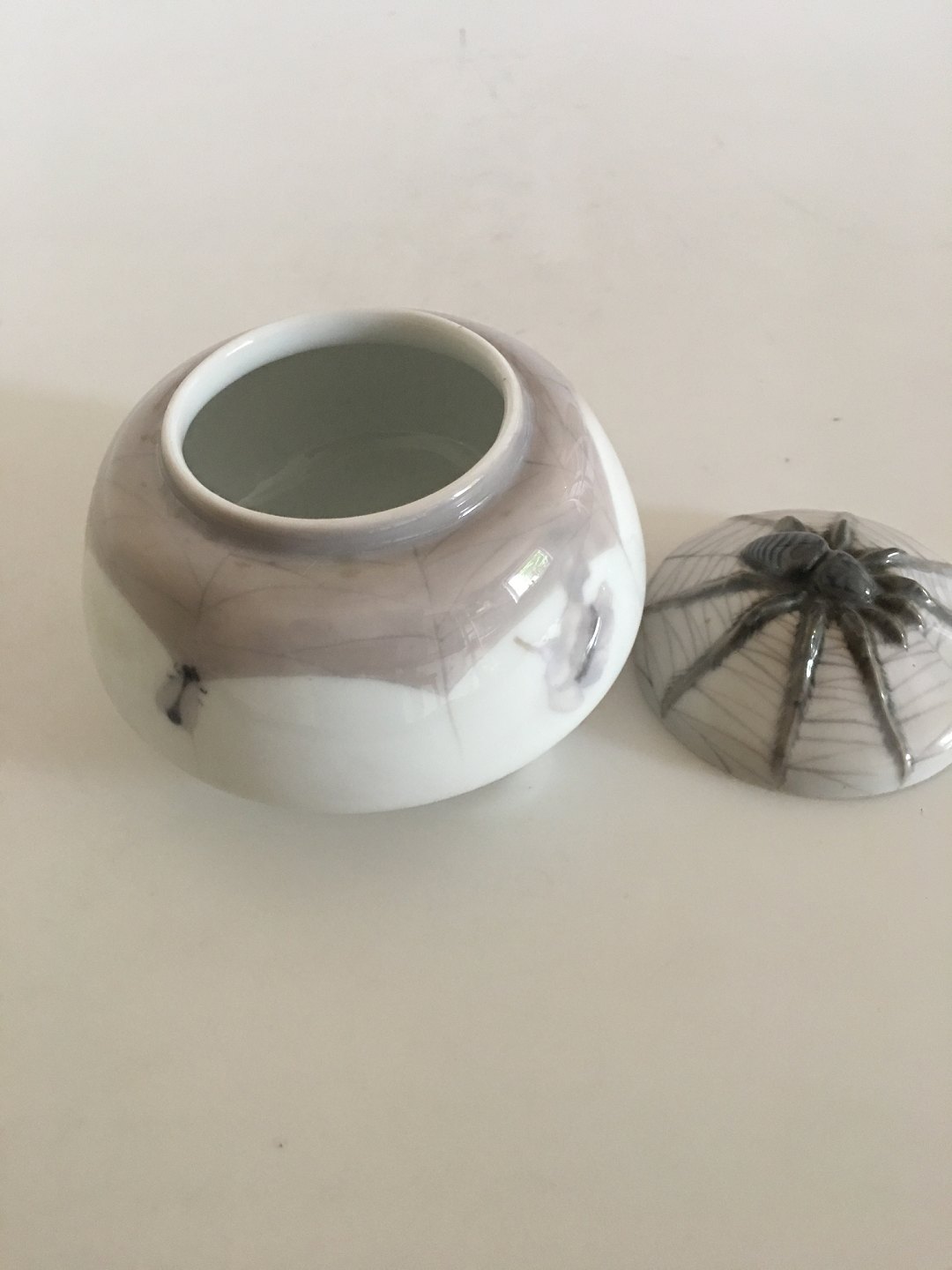 Royal Copenhagen Art Nouveau Lidded Bowl No 317/24 with Tarantulas. 13 cm diameter. 10 cm H. 1st Quality. Has a hairline in the lid.