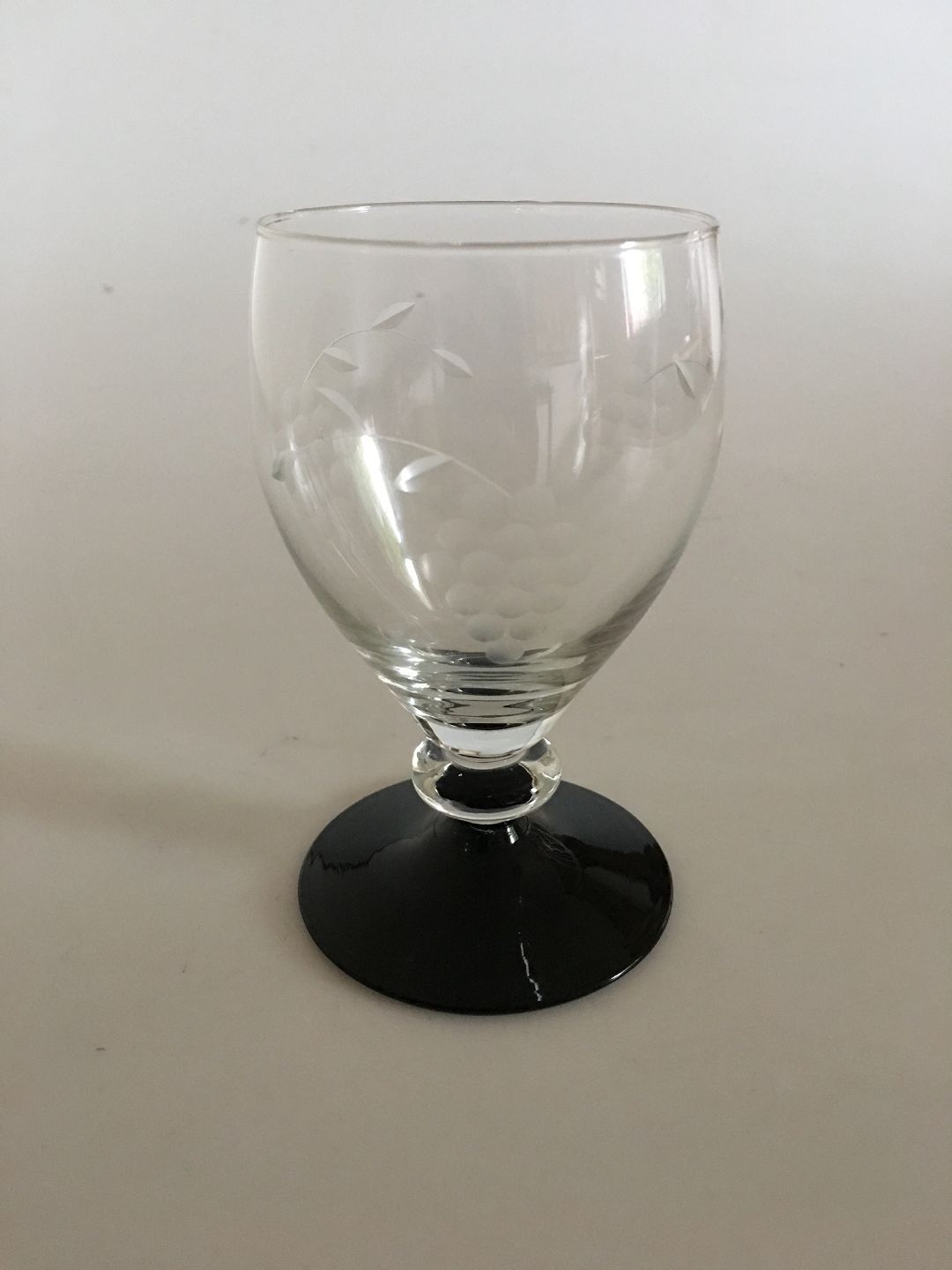 "Jane" Blackfooted Claret Glass from Holmegaard with ingraved grapes. 12 cm H. Manufactured first in 1942.