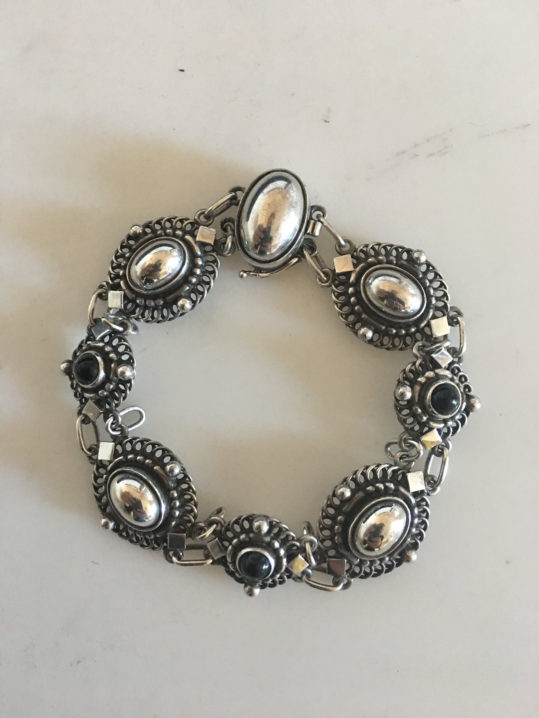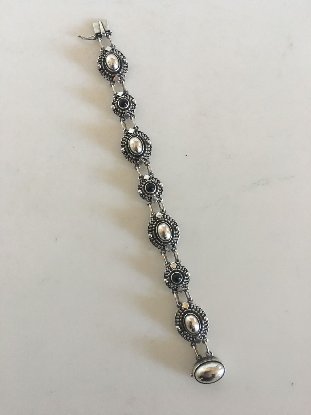 Georg Jensen Sterling Silver Bracelet No. 419 with Black Onyx Stones. Measures 19.5 cm L (7 43/64"). 1.8 cm Wide (0 45/64"). Weighs 35 grams (1.25 oz). Manufactured after 1945.