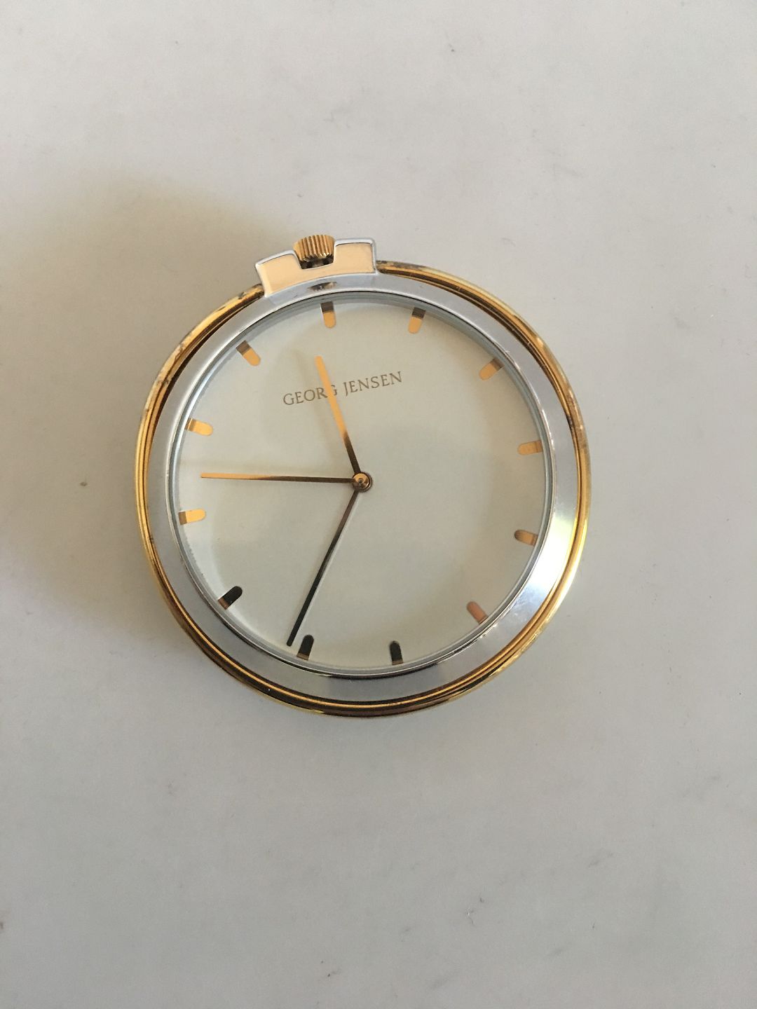Georg Jensen Sterling Silver Pocket watch / Table watch No. 355 designed by Lene Munthe. With gilded round circle / standing mechanism. Weighs 89 grams (3.15 oz). Meaures 5.5 cm diameter (2 11/64").