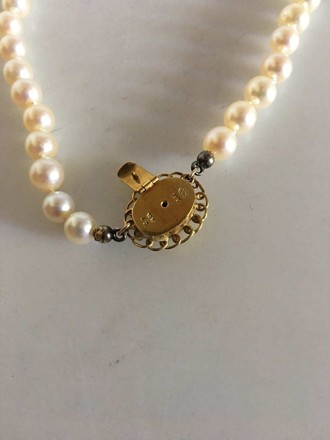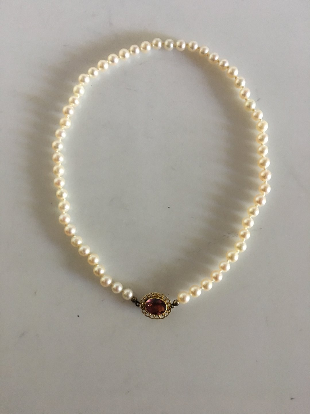 Georg Jensen Pearl Necklace with 18K Gold Lock / Jewelry Pendant with Rosa Quartz. The necklace is 42 cm L (16 17/32") and consists of 56 graduated cultured pearls similar in size ranging between 4 and 5 mm. The necklace is manufactured after 1945.