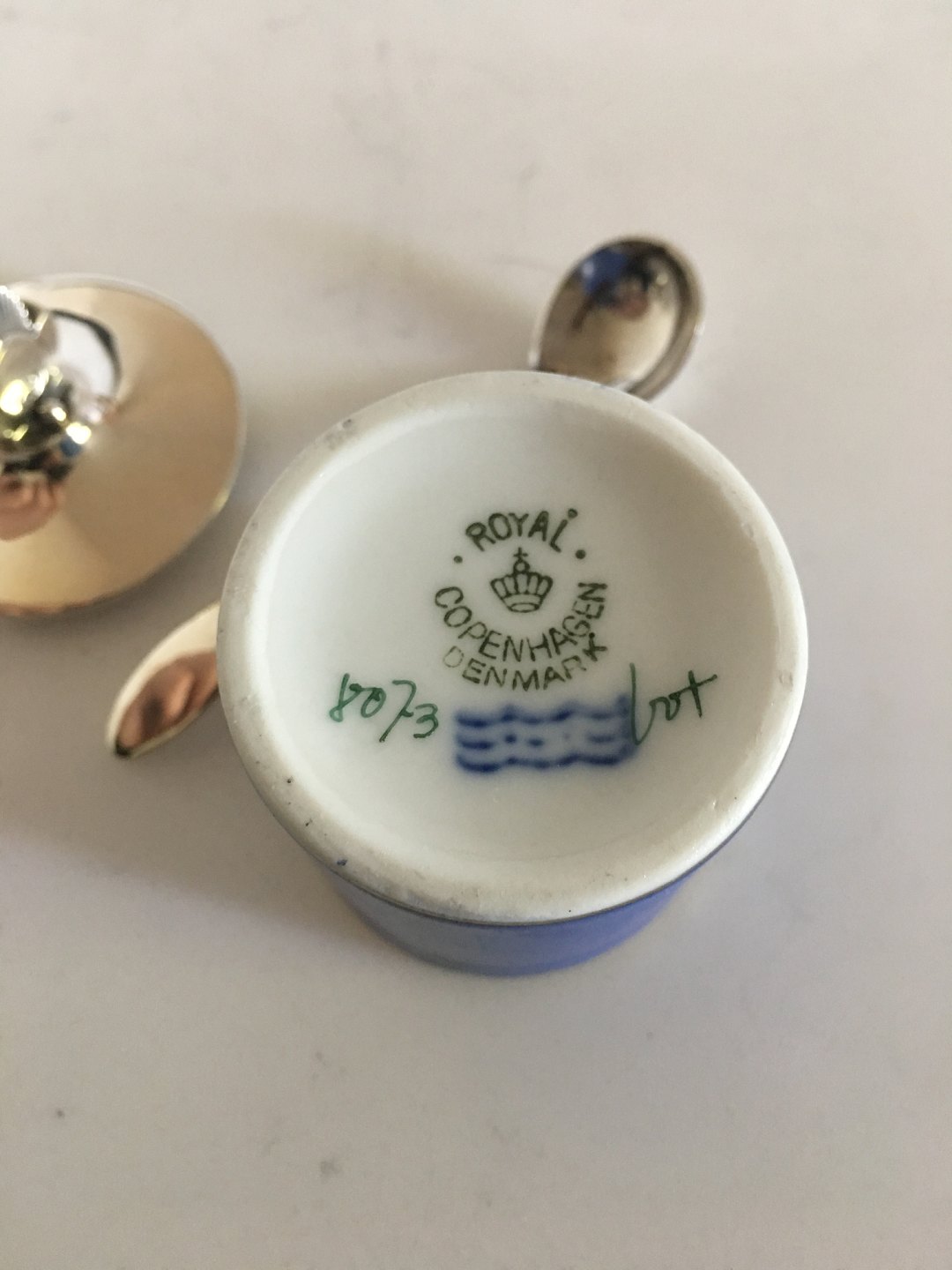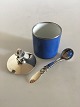 Georg Jensen / Royal Copenhagen Mustard Jar No. 8073 with Cactus Lid No. 815C and Cactus Mustard Spoon. Jar measures 4.5 cm H. Lid measures 4.5 cm diameter. Combined weight of lid and spoon is 37 grams. Manufactured after 1945.