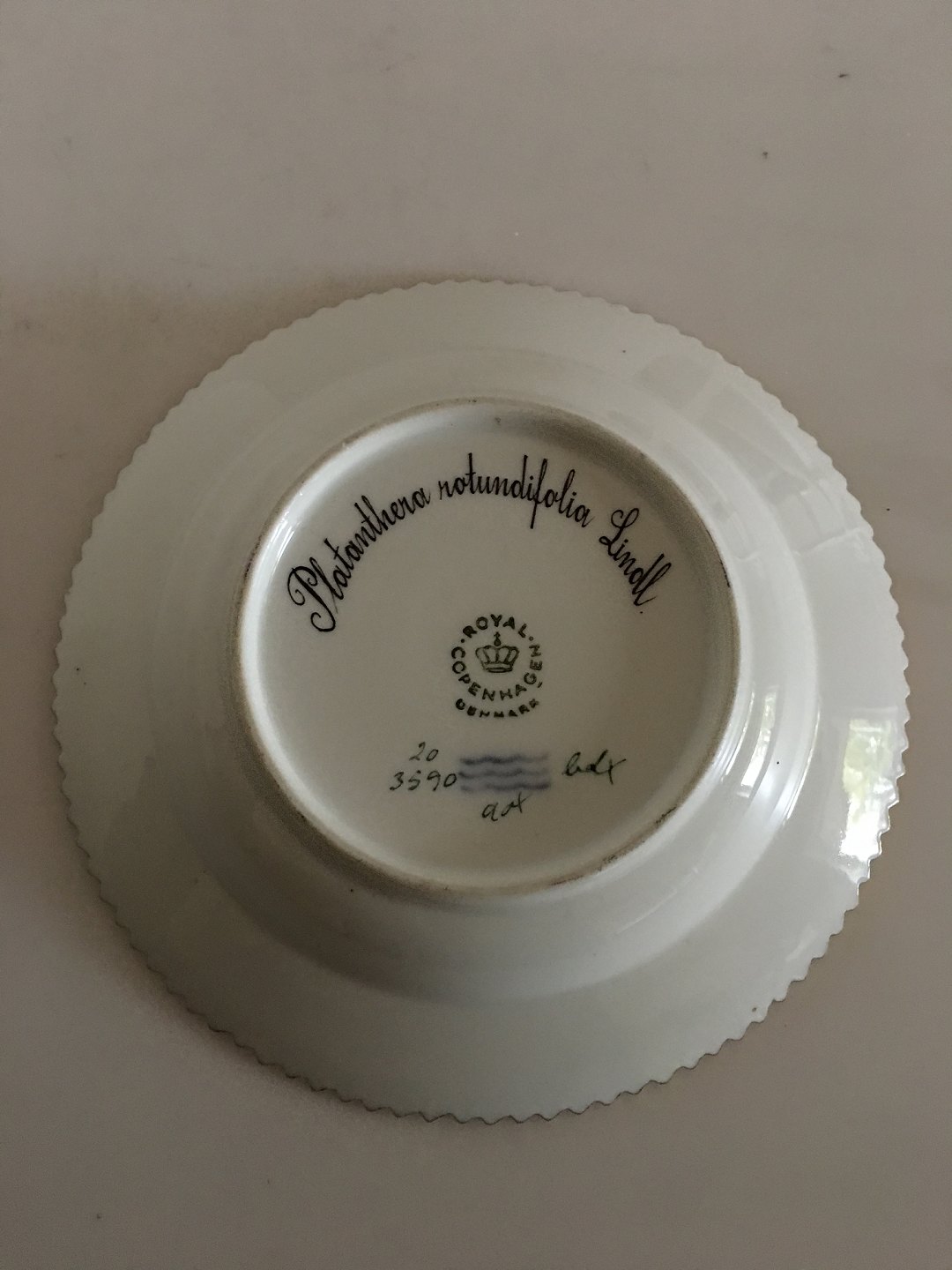 Royal Copenhagen Flora Danica Small Deep Plate No. 3590. Latin Name: Plathanthera Rotundifolia Lindl. 14.5 cm (5 45/64"). In perfect condition.