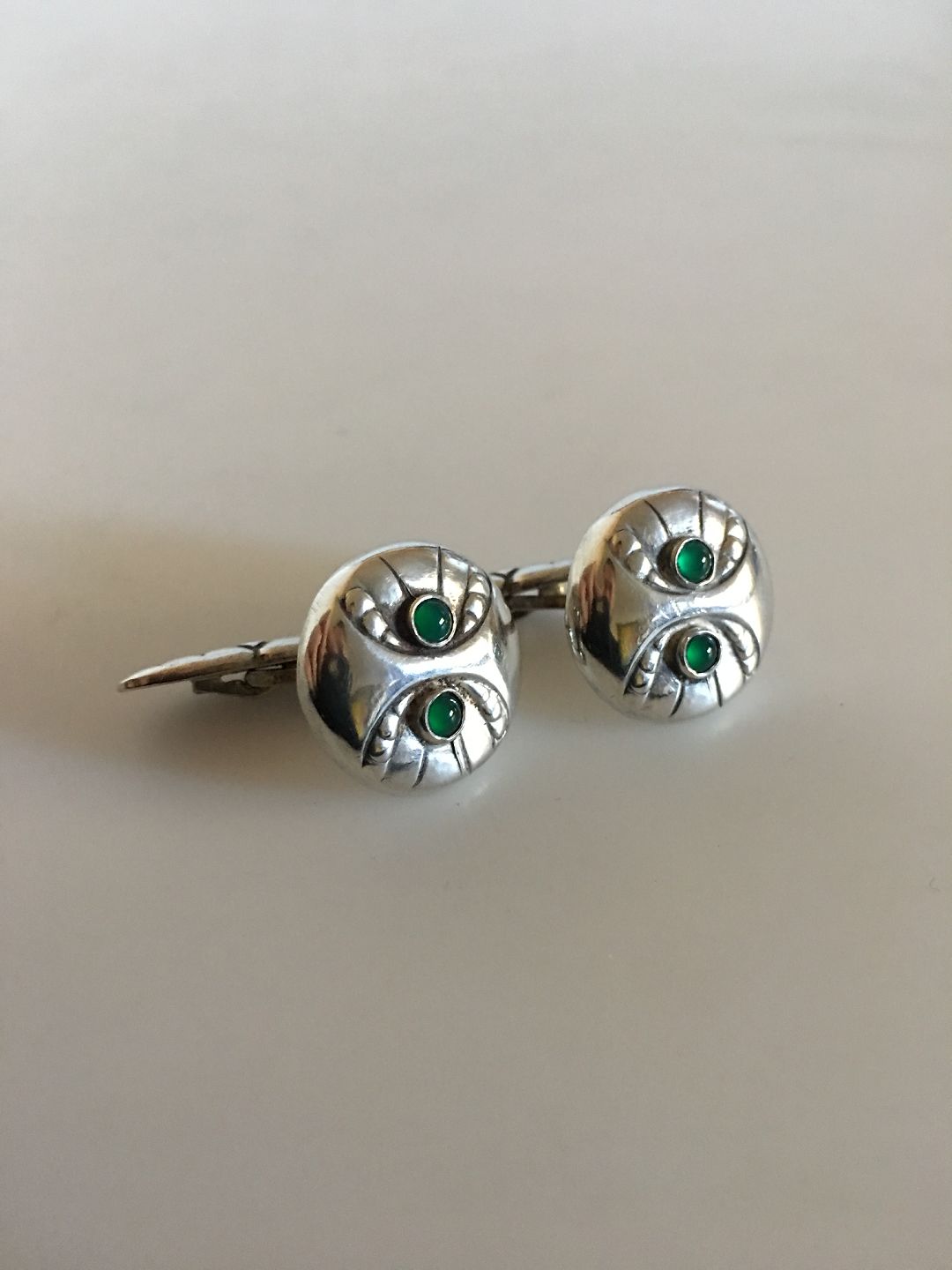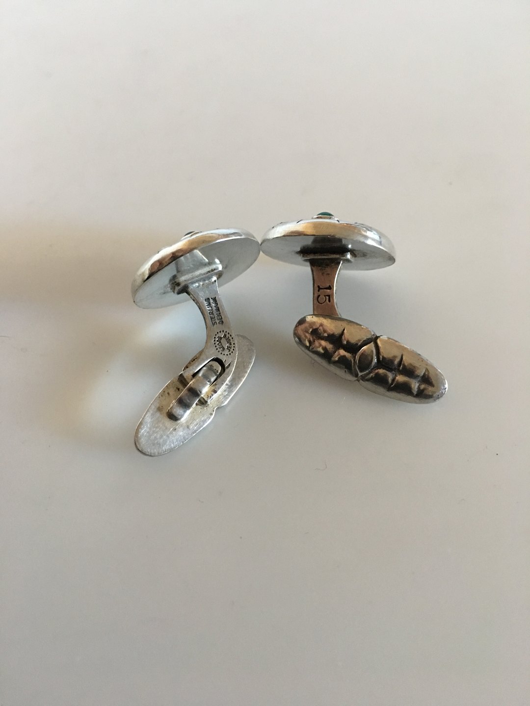 Georg Jensen Sterling Silver Cufflinks No 15 with Green Agates. Measures 1.6 cm / 0 5/8 in. diameter. Combined weight of 11 g/ 0.38 oz. From after 1945.