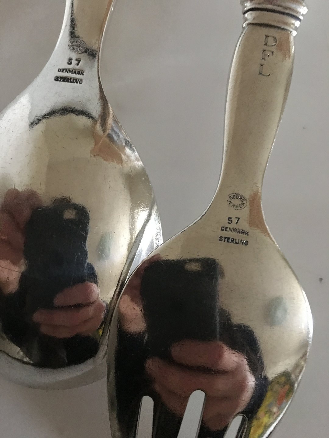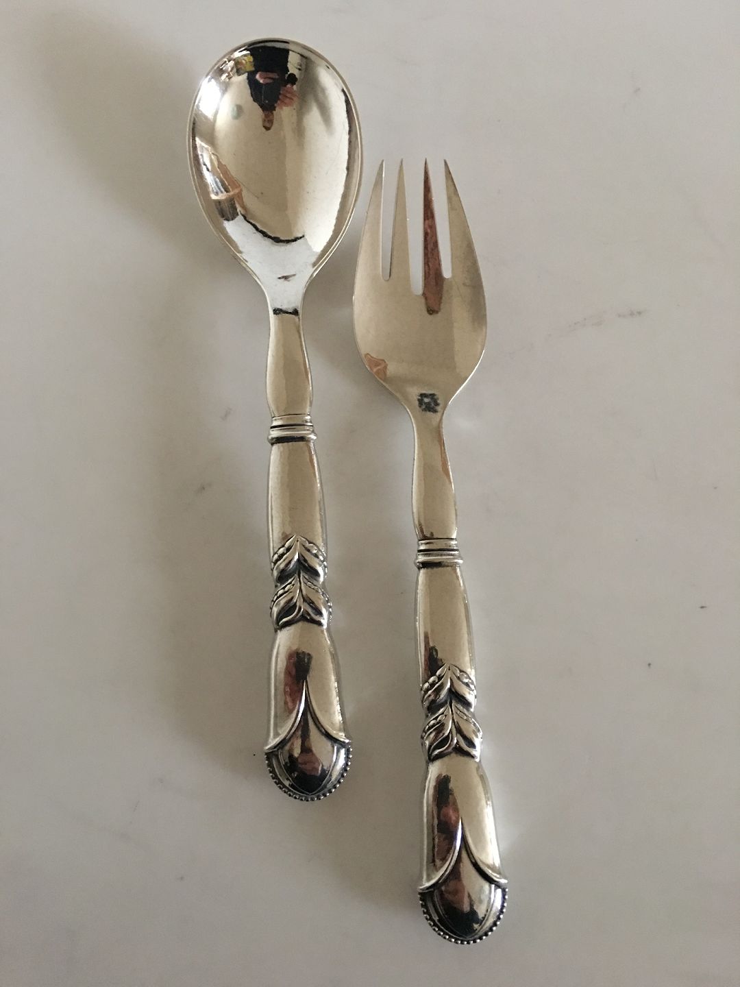Georg Jensen Sterling Silver Ornamental Serving Set No. 57. Spoon and Fork measures 22 cm L (8 21/32"). Manufactured after 1945.