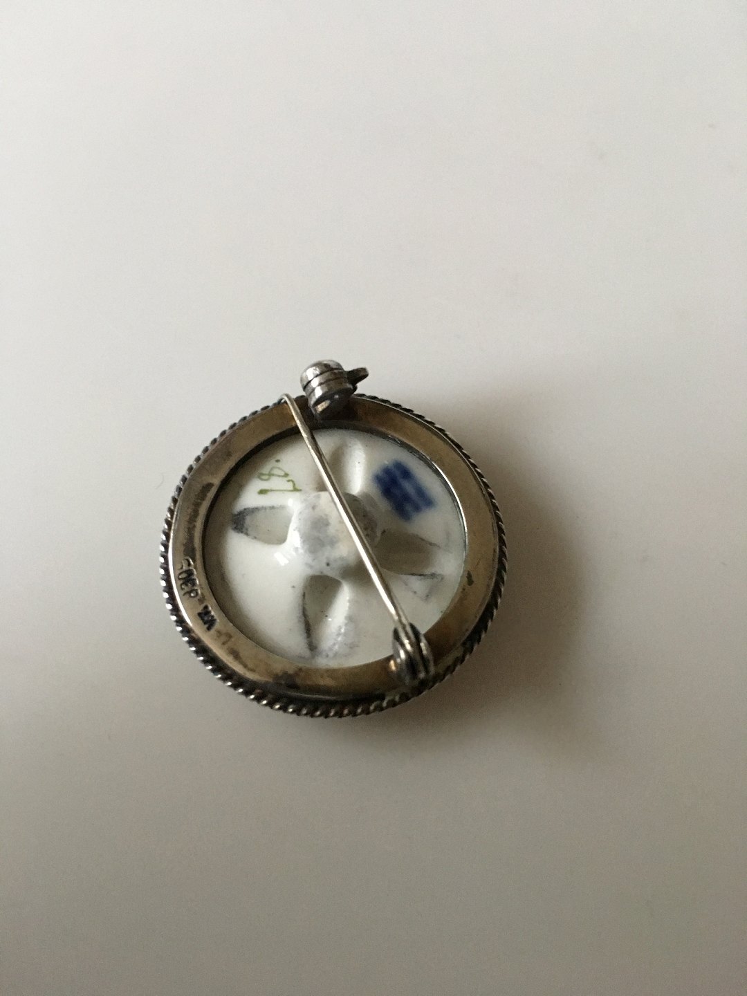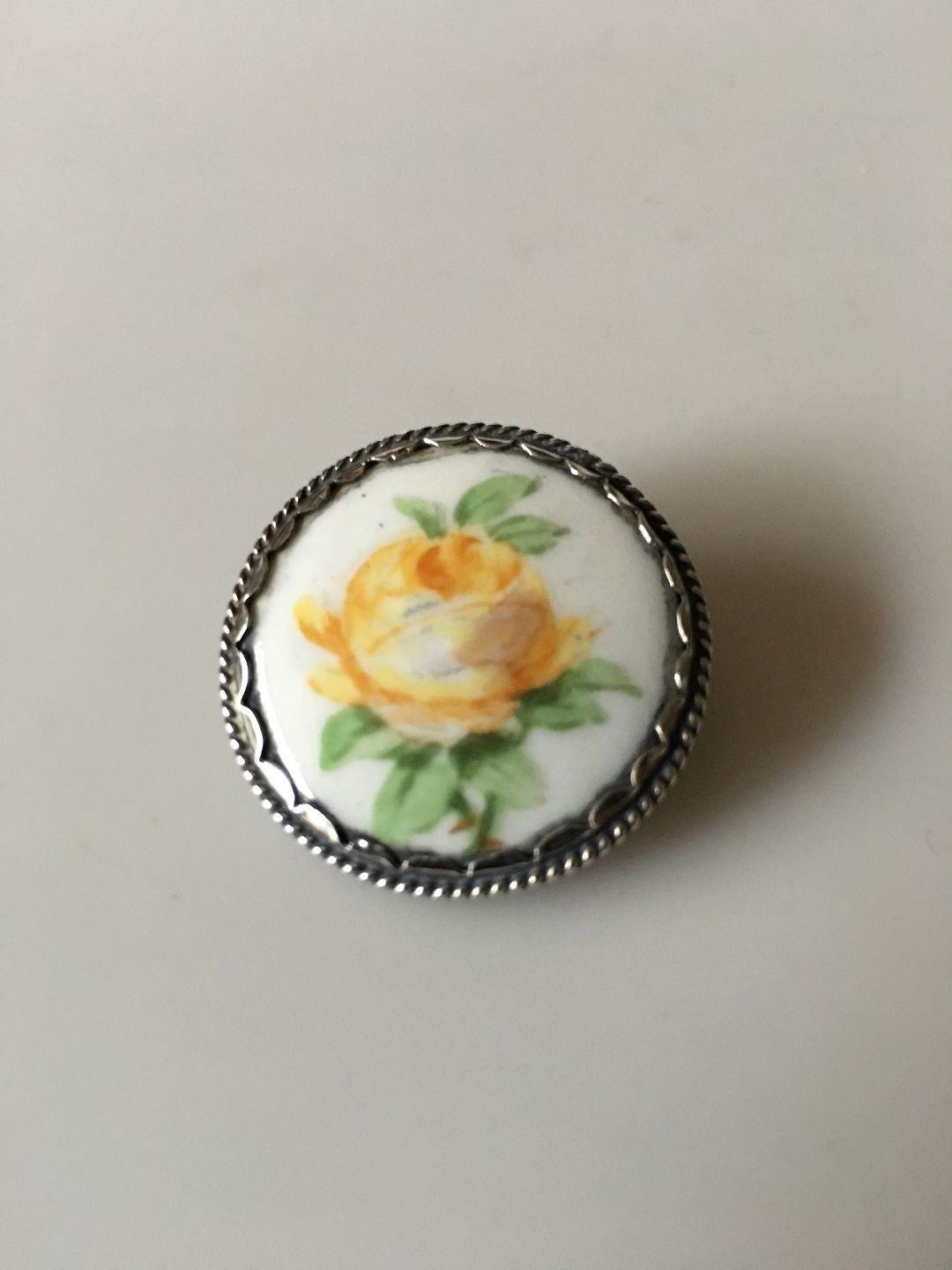 Royal Copenhagen Porcelain Button in Silver Mounting with Yellow Rose Decoration.