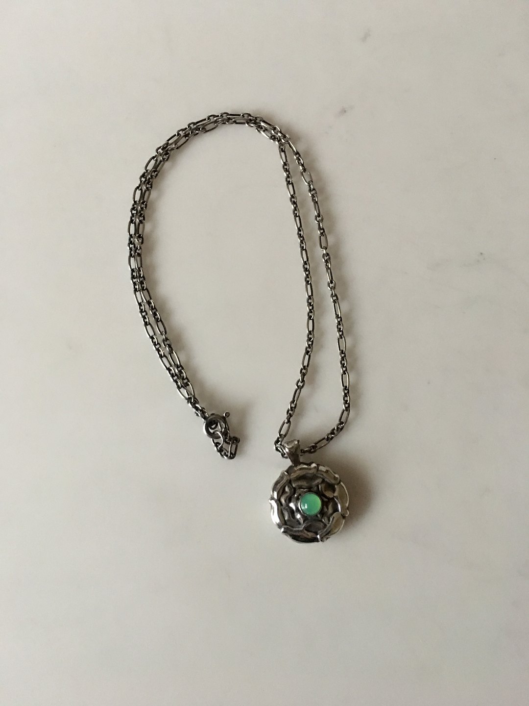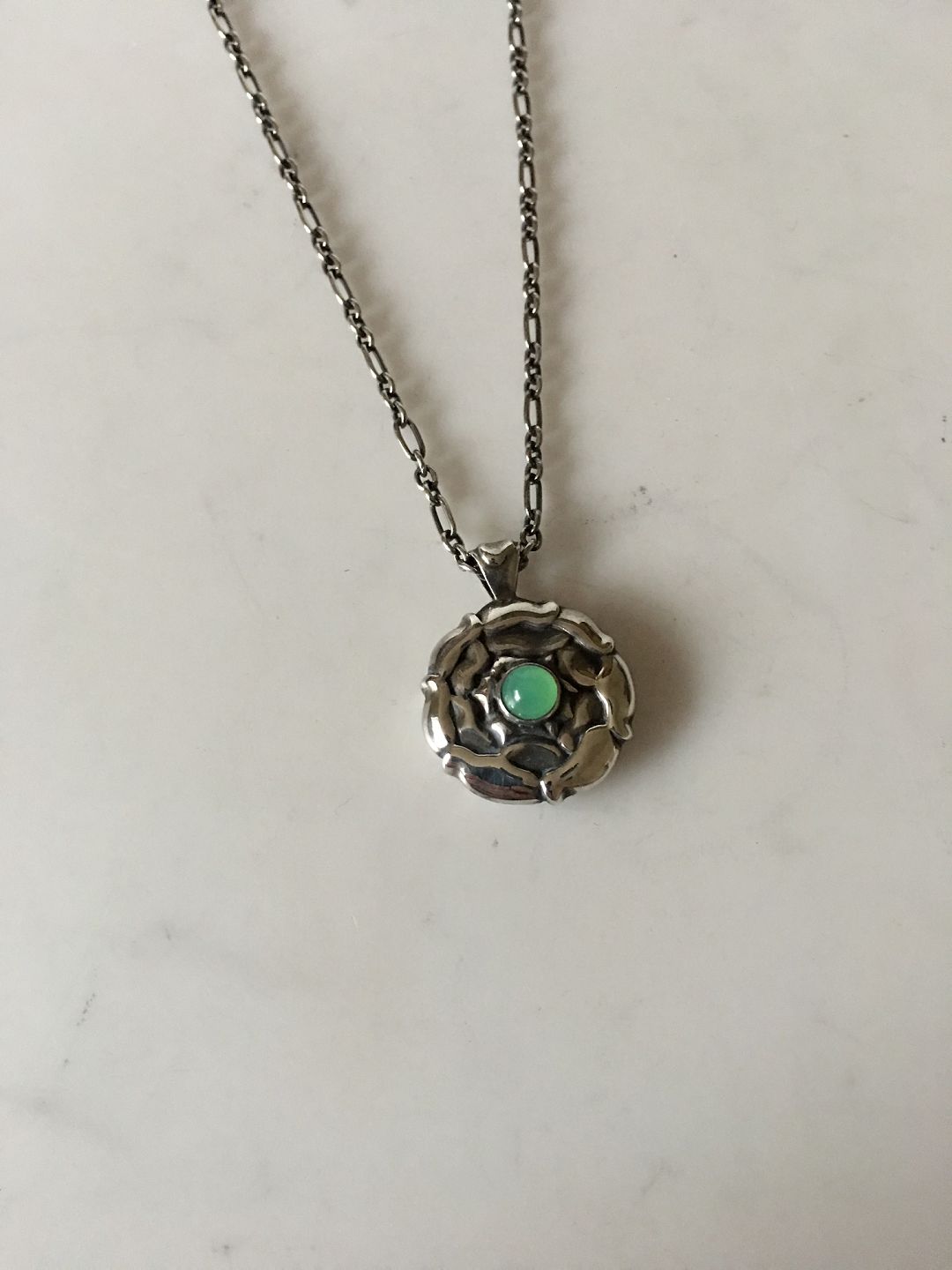 Georg Jensen Sterling Silver Necklace with Green Stone. Pendant measures 2 cm / 0 25/32 in. diameter. Chain measures 44 cm / 17 21/64 in. Weighs 15.5 g / 0.55 oz.