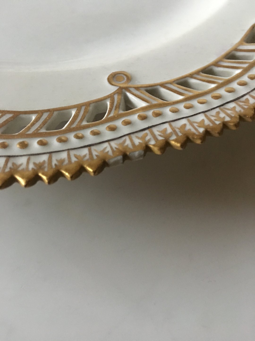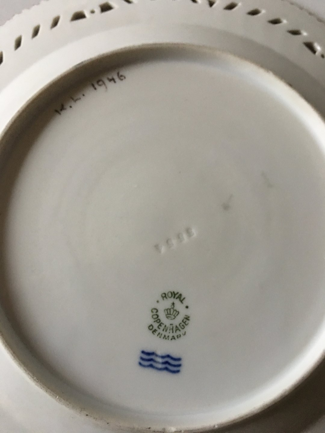 Royal Copenhagen Flora Danica Plate with Pierced Border og Monogram. 2nd Quality and is chipped on the edge. Measurers 23 cm diameter (9 1/16").