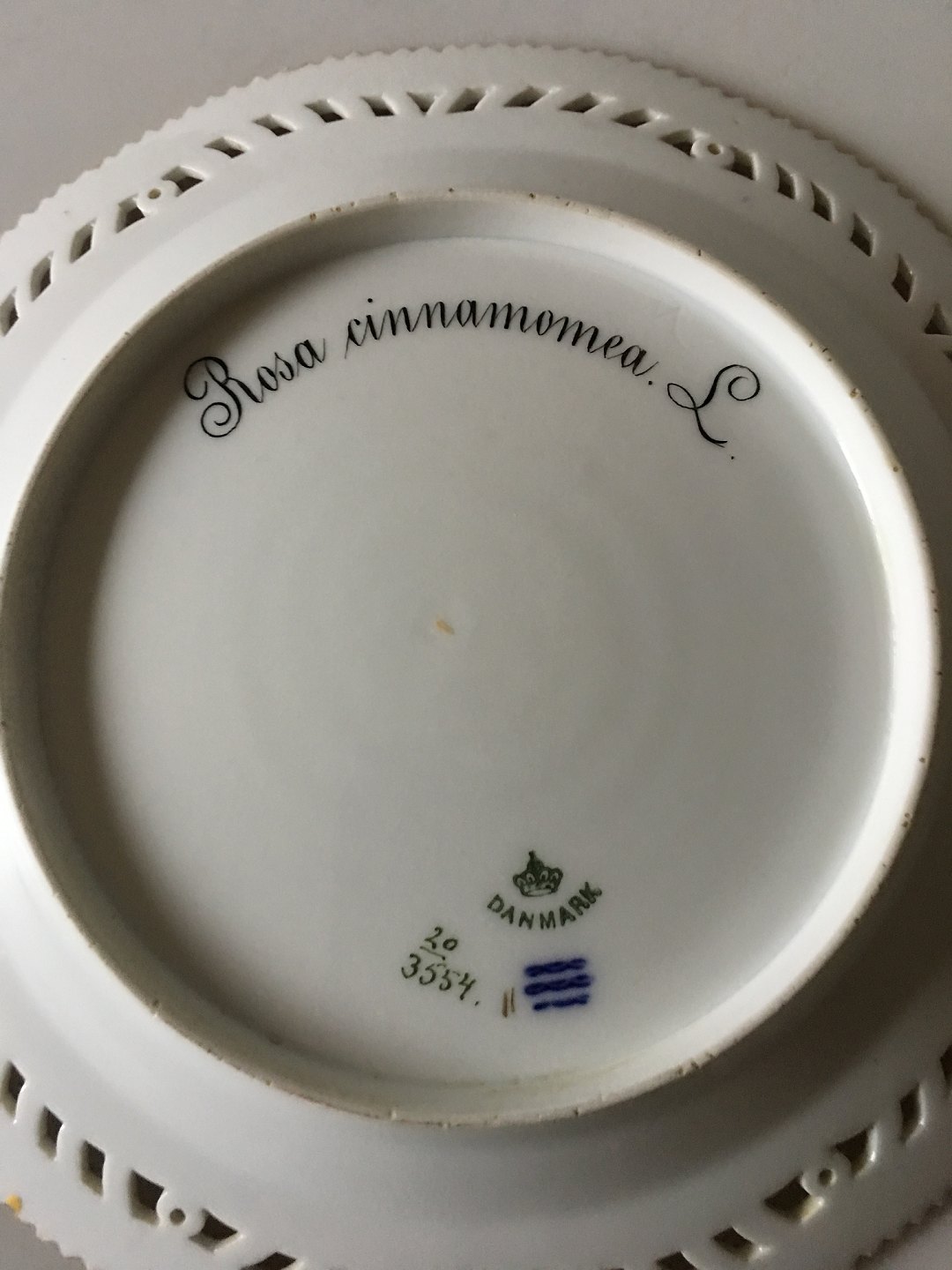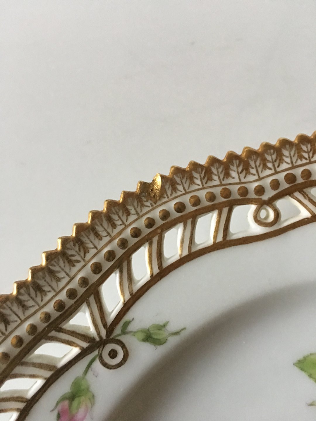 Royal Copenhagen Flora Danica Luncheon Plate with Pierced Border No. 20/3554. The plate has a chip on the edge that has been repainted with gold. Measures 22.5 cm diameter (8 55/64").