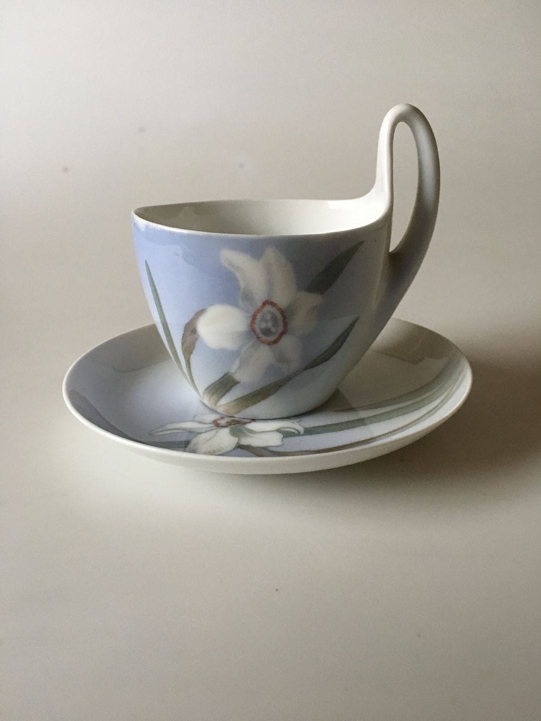 Royal Copenhagen Art Nouveau Small High Handled Cup and Saucer No. 81/4. Cup and Saucer are in fine condition. Cup measures 5.2 cm H (8 cm H measured to the top of the handle). 2nd Quality