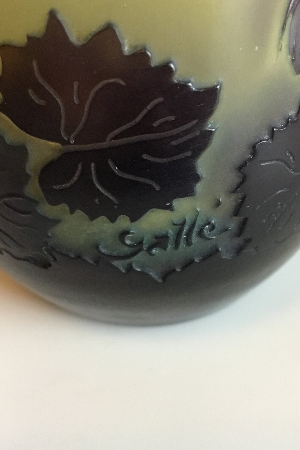 Émile Gallé Vase. Art Nouveau, Signed. Green frosted vase with black Flowers. Measures 15 cm / 5 29/32"