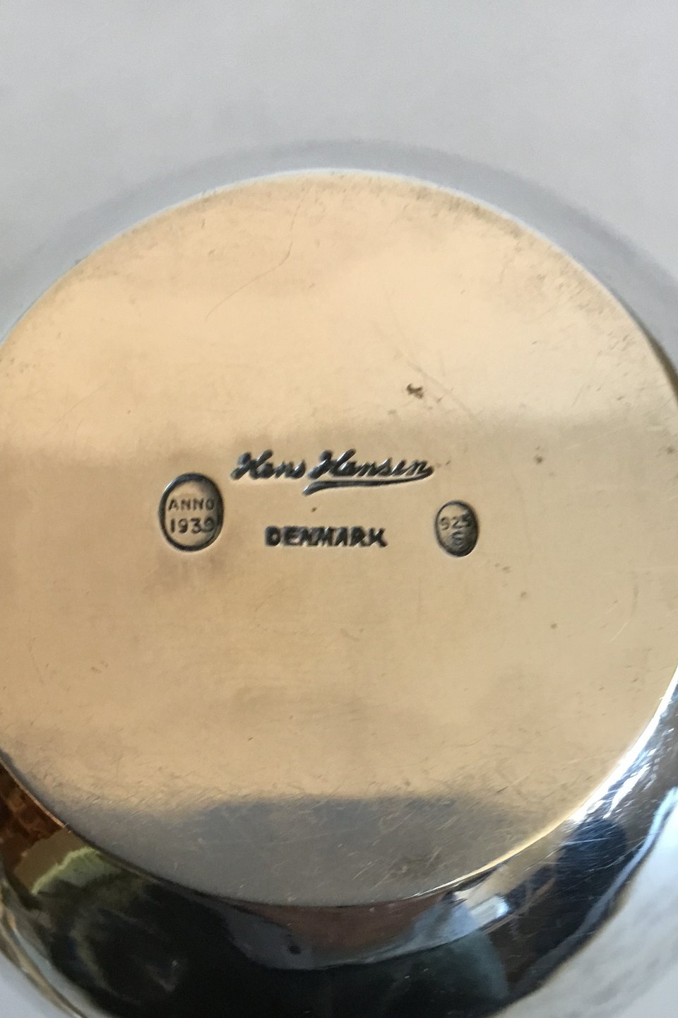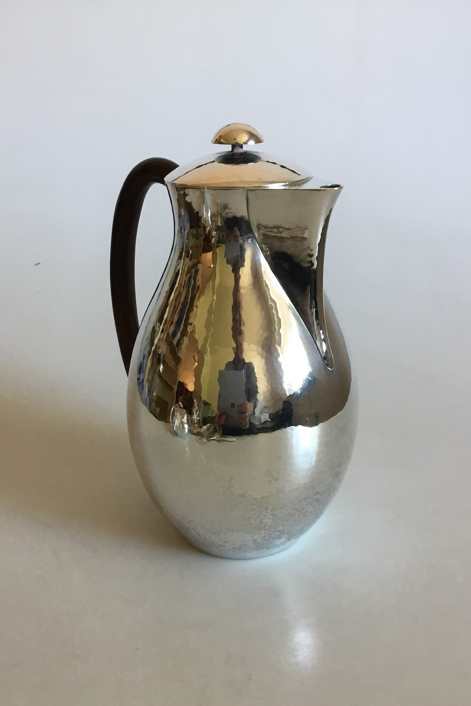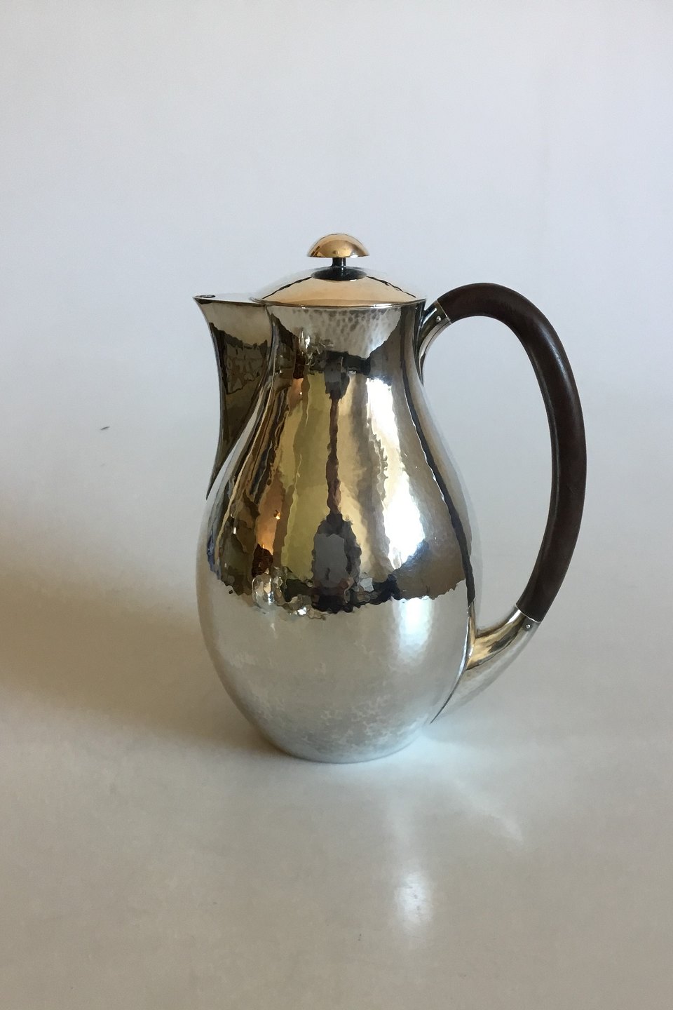 Hans Hansen Sterling Silver Coffee Set. Consists of Coffee Pot, Creamer and Sugar Bowl. Handle made of wood. Coffee Pot 20.5 cm / 8 5/64 in., weighs 619 g / 21.85 oz. Creamer 11.5 cm / 4 17/32 in., weighs 222 g / 7.85 oz. Sugar Bowl 9 cm / 3 35/64 in., weighs 400 g / 14.10 oz.