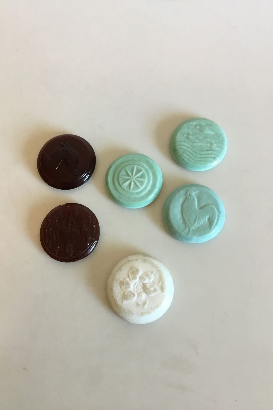 6 old pebbles of colored glass, one unused. Measures approx. 6 cm / 2 23/64 in. dia. Holmegaard Fyns Glasværk