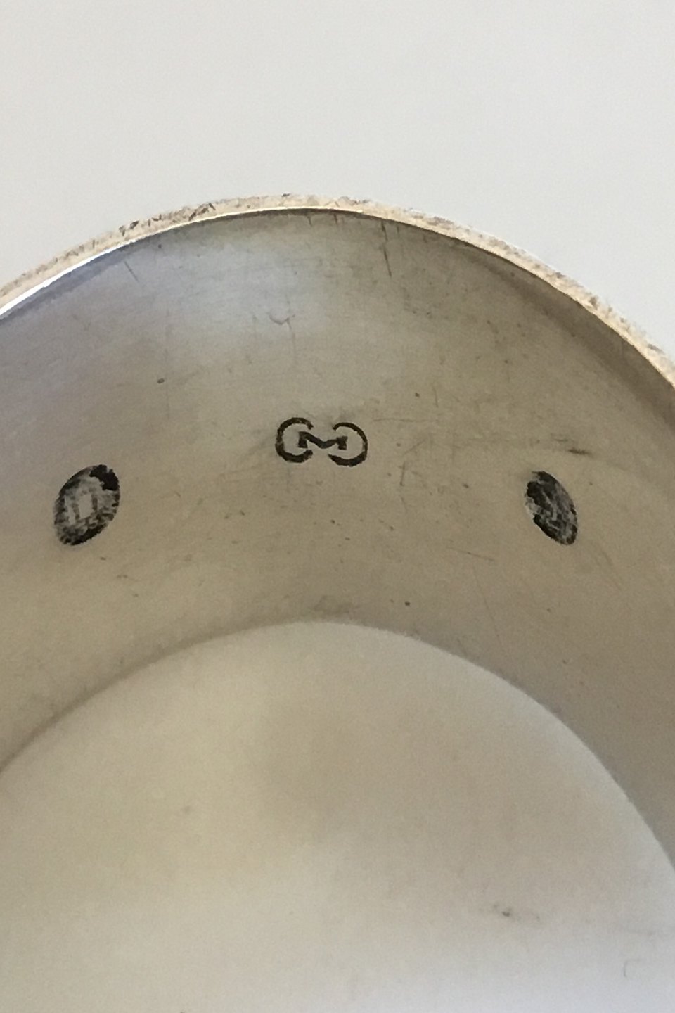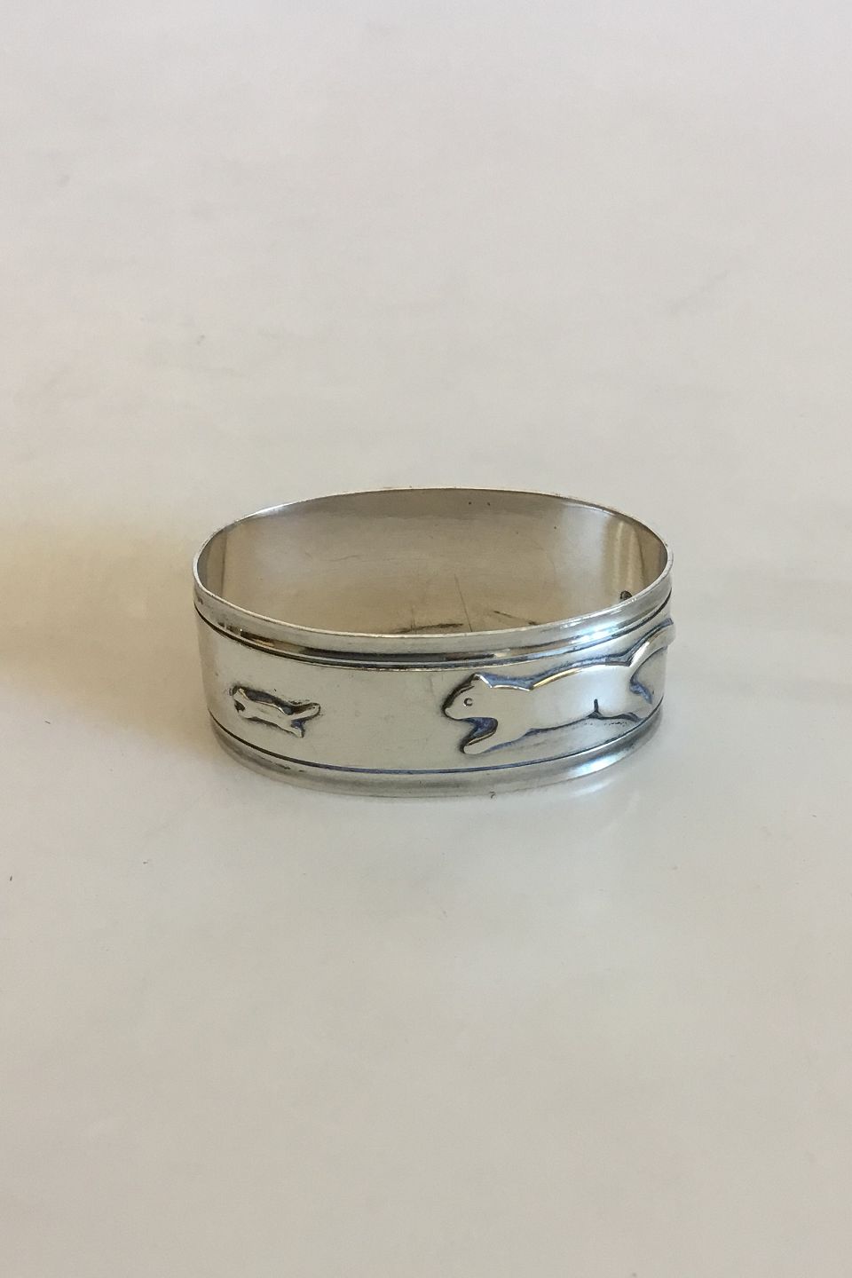 Cohr Silver Napkin Ring with Cat after Mouse. Measures 5 cm / 1 31/32 in. x 3 cm / 1 3/16 in. Weighs 20.9 g / 0.74 oz.
