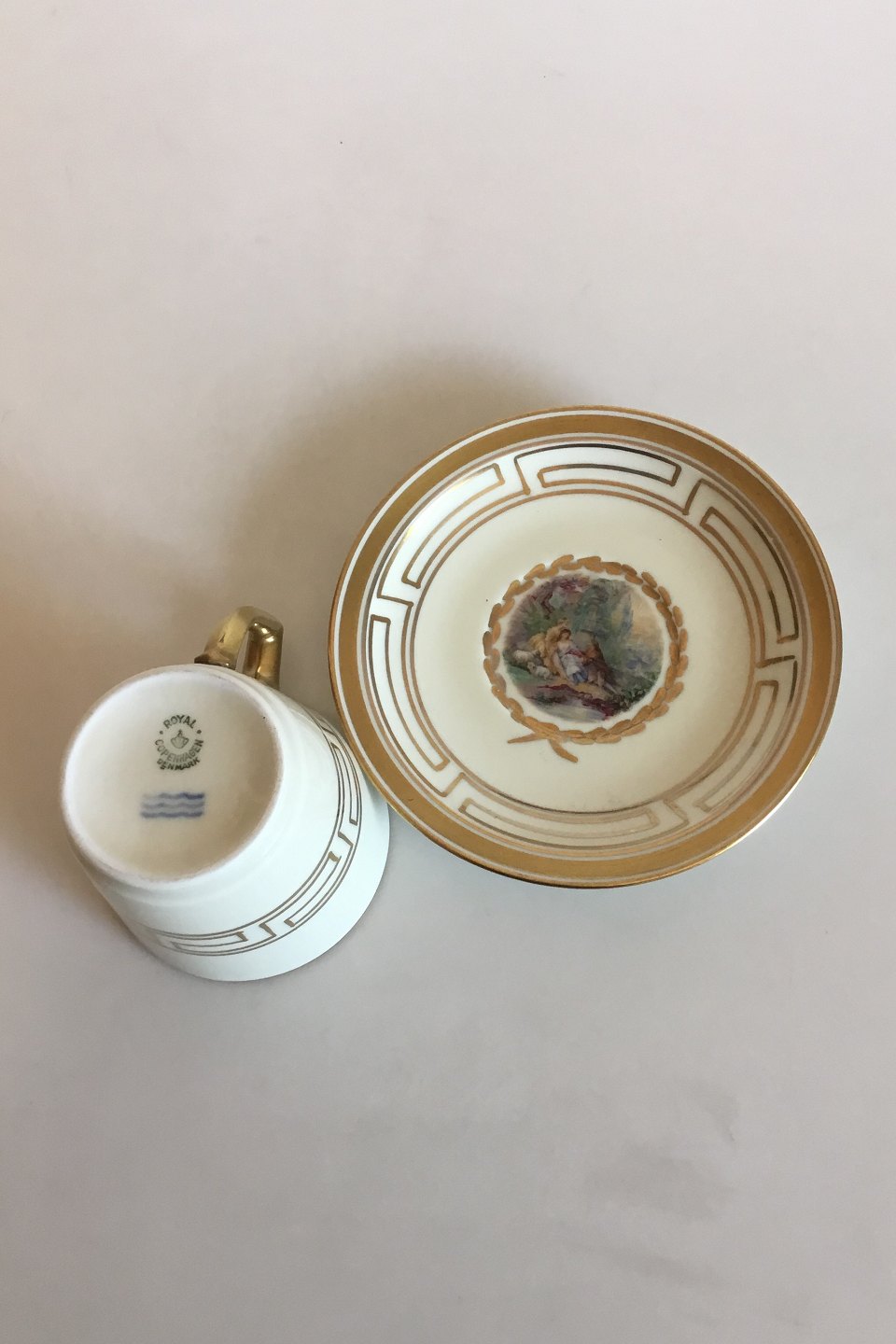 Royal Copenhagen Mythological Decoration with Cupid Coffee Cup. Measures Cup: 7 cm / 2 3/4 in. x 7.6 cm / 2 63/64 in dia. Saucer: 13.3 cm / 5 15/64 in.