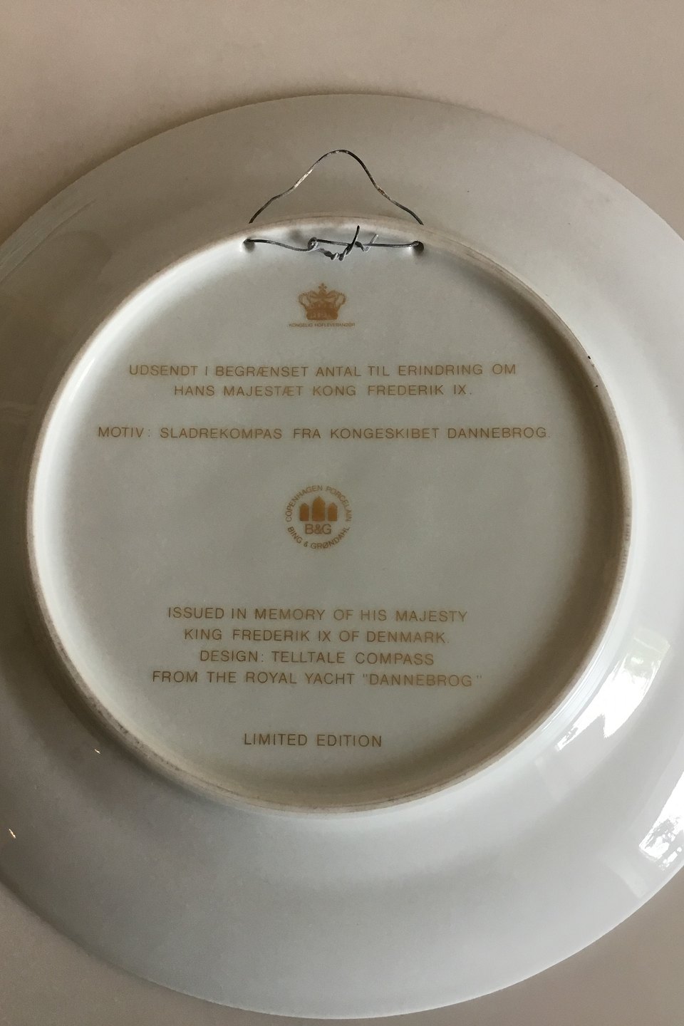 Bing and Grondahl Commemorative Plate Frederik IX REX 11.3.1899-14.1.1972. In memory of His Majesty Frederik IX. Motif: Telltale Compass from the Royal Yacht Dannebrog. Measures 24.7 cm / 9 23/32 in.