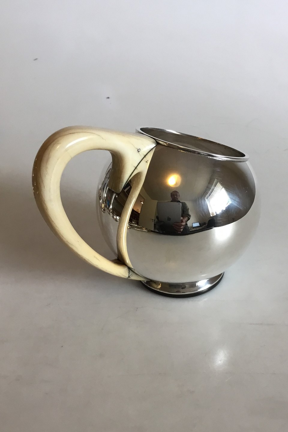 F. Hingelberg Aarhus Sterling Silver Spherical Pitcher with Handle of Bone. Measures 12.8 cm / 5 3/64 in. x 11.5 cm / 4 17/32 in. Weighs 352 g / 12.40 oz.