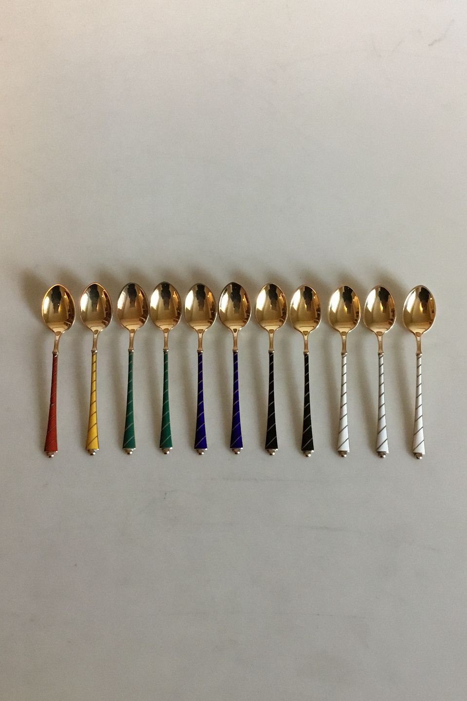 ELA Denmark Set of 11 pcs. Mocca Spoons in Gilted Sterling Silver with Colered Emanel. Measures 9.3 cm / 3 21/32 in.