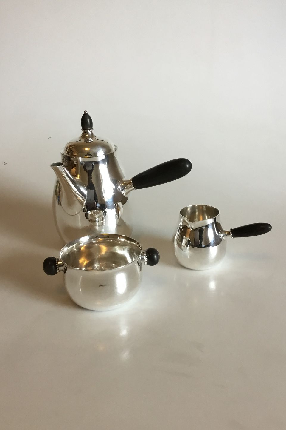 Georg Jensen Coffee Set consists of: Coffee Pot No 80, Creamer No 80 A and Sugar Bowl No 80 B. Measures: Coffee Pot 17.5 cm / 6 57/64 in. Creamer 6.5 cm / 2 9/16 in. Sugar Bowl 5.5 cm / 2 11/64 in. Weighs Coffee Pot 408 g / 14.40 oz. Creamer 102 g / 3.60 oz. and Sugar Bowl 108 g / 3.80 oz.