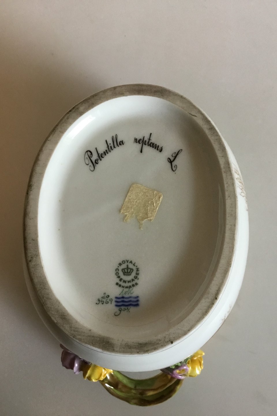 Royal Copenhagen Flora Danica Oval Wine Cooler No 20/3569. Measures 16.5 cm / 6 1/2 in. x 27.5 cm / 10 53/64 in. 1st Quality. Latin name: "Potentilla reptans L.". 1969