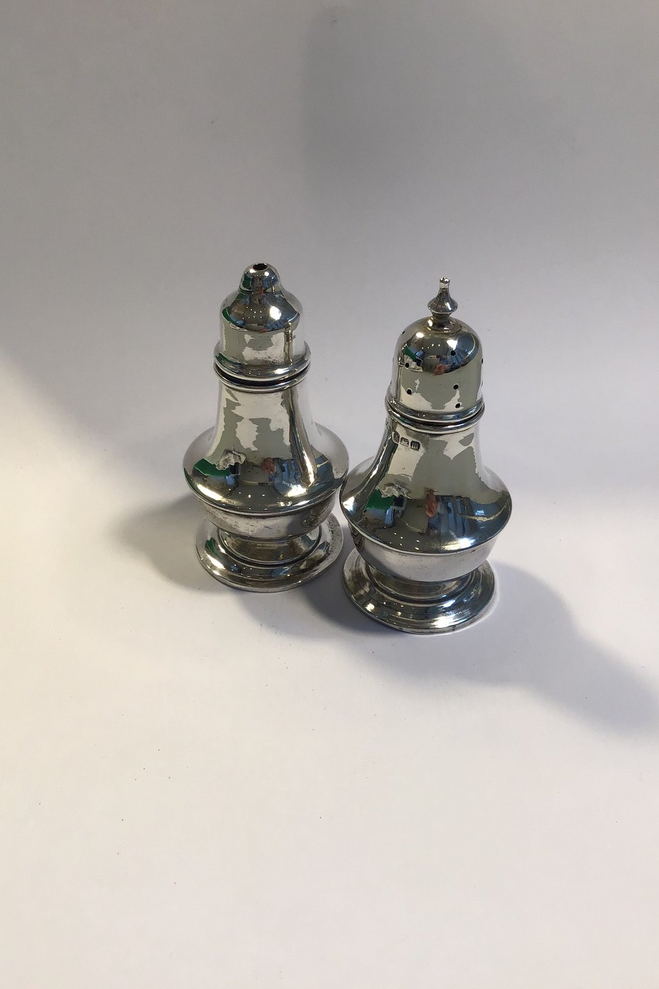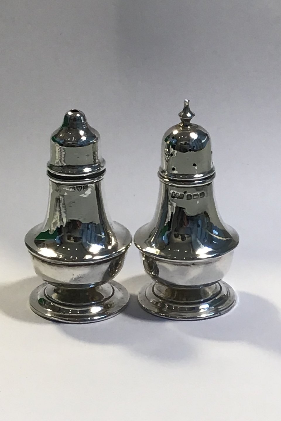 English Salt & Pepper shakers on raised base. Hallmarked Chester and Birmingham H 7 cm/2.75"
