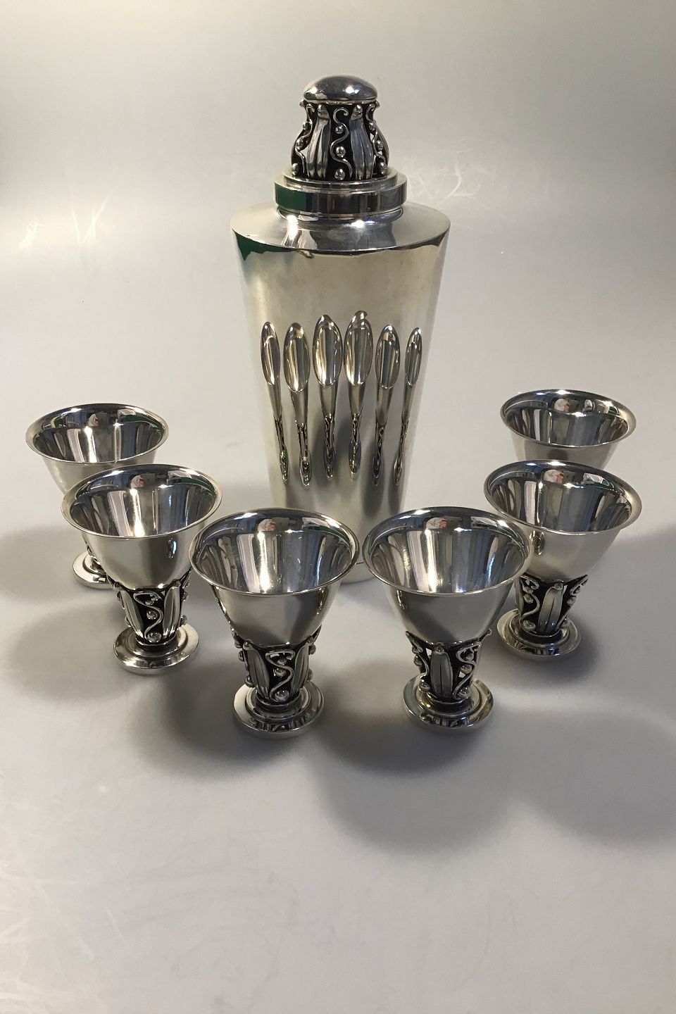 Evald Nielsen Sterling Silver Cocktailshaker and six drinking cups Shaker H 23 cm/9.05" Weight 589gr/20.79 oz Cup H 8 cm/3.14" Weight 85 gr/3.01 oz.