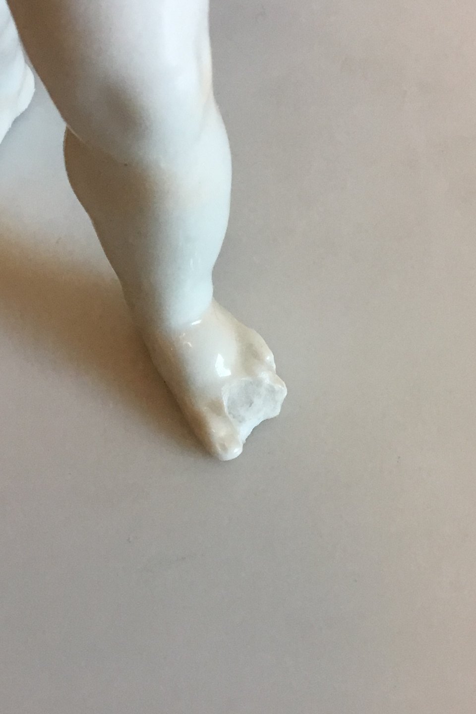 Large tableware made of porcelain, richly modeled and adorned with pousing flowers, decorated in colors and gold, carried by four putti. Plaue mark from 1916. Measures 31 cm / 12 13/64 in. x 16 cm / 6 19/64 in. Chip on one foot