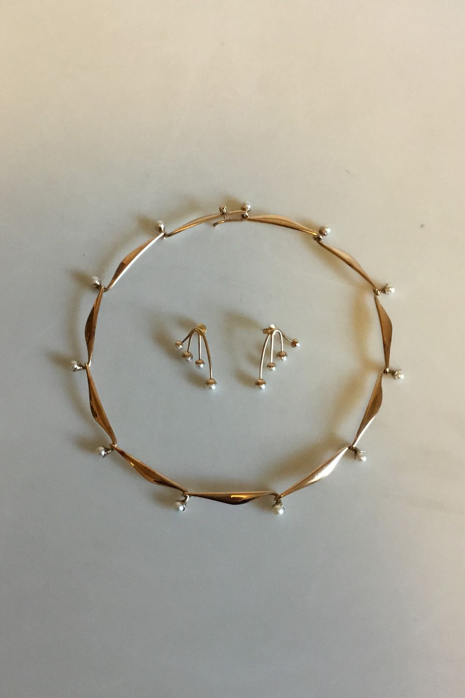 Bent Knudsen Secmented Necklace and Earsticks in 14 K Gold with Pearls. Measures Necklace cm / 17 23/32 in, Weighs 1.34 oz. Earsticks 3 cm / 1 3/16 in. Weighs 0.18 oz.