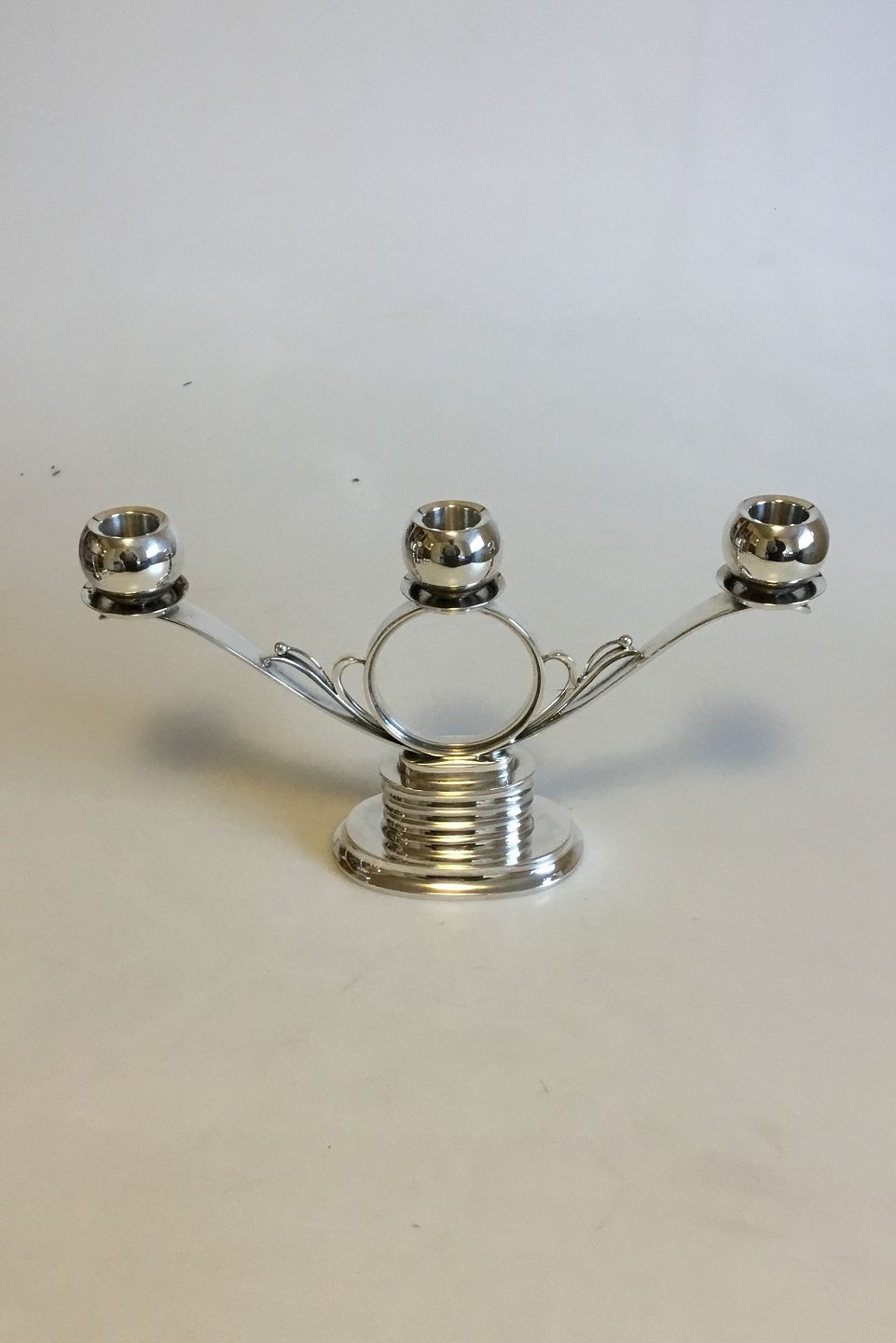 Hans Hansen Sterling Silver three-armed candlestick. From 1937. Measures 26 cm / 10 15/64 in. x 15 cm / 5 29/32 in. Weighs 482 g / 17.00 oz.