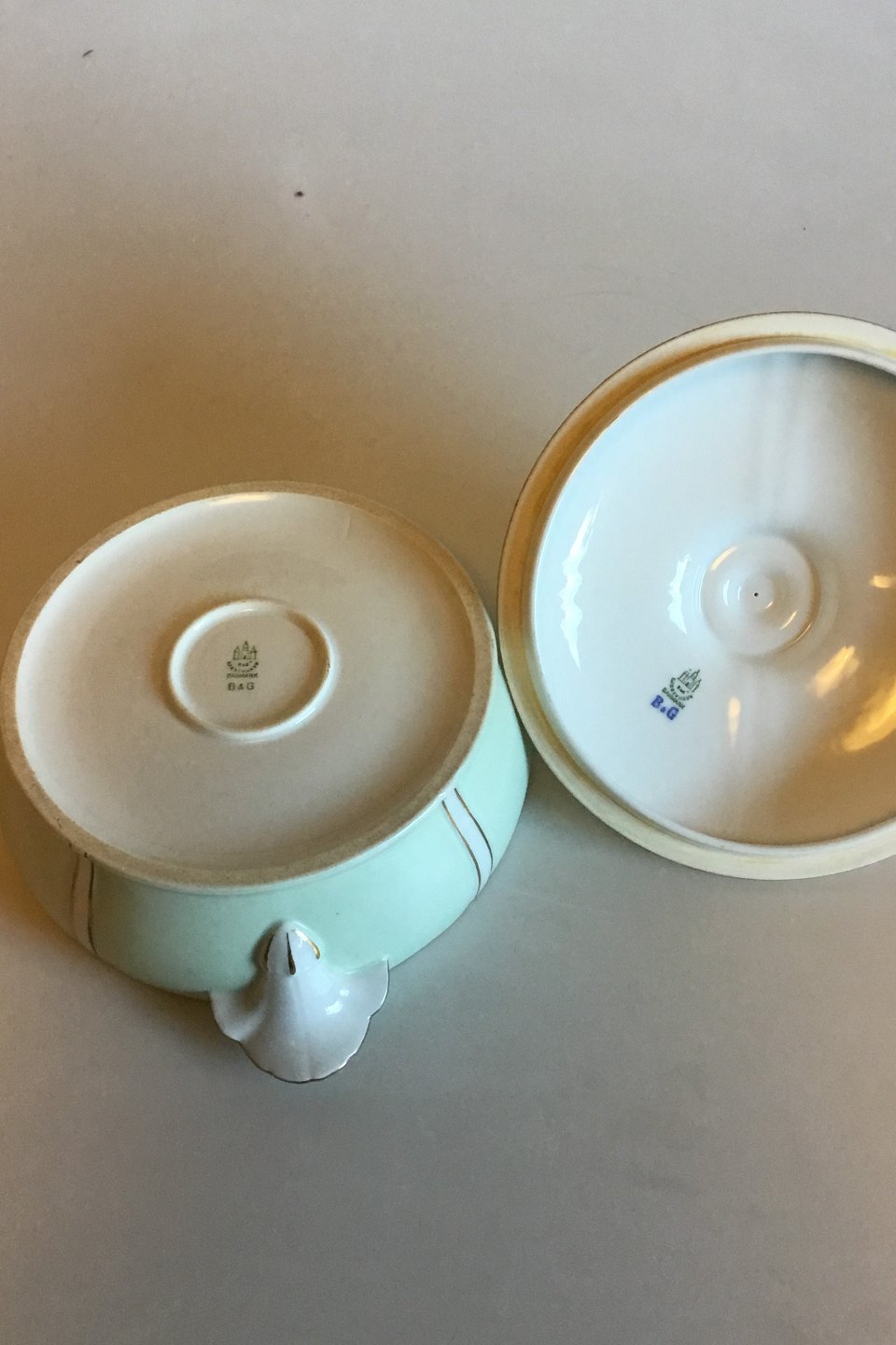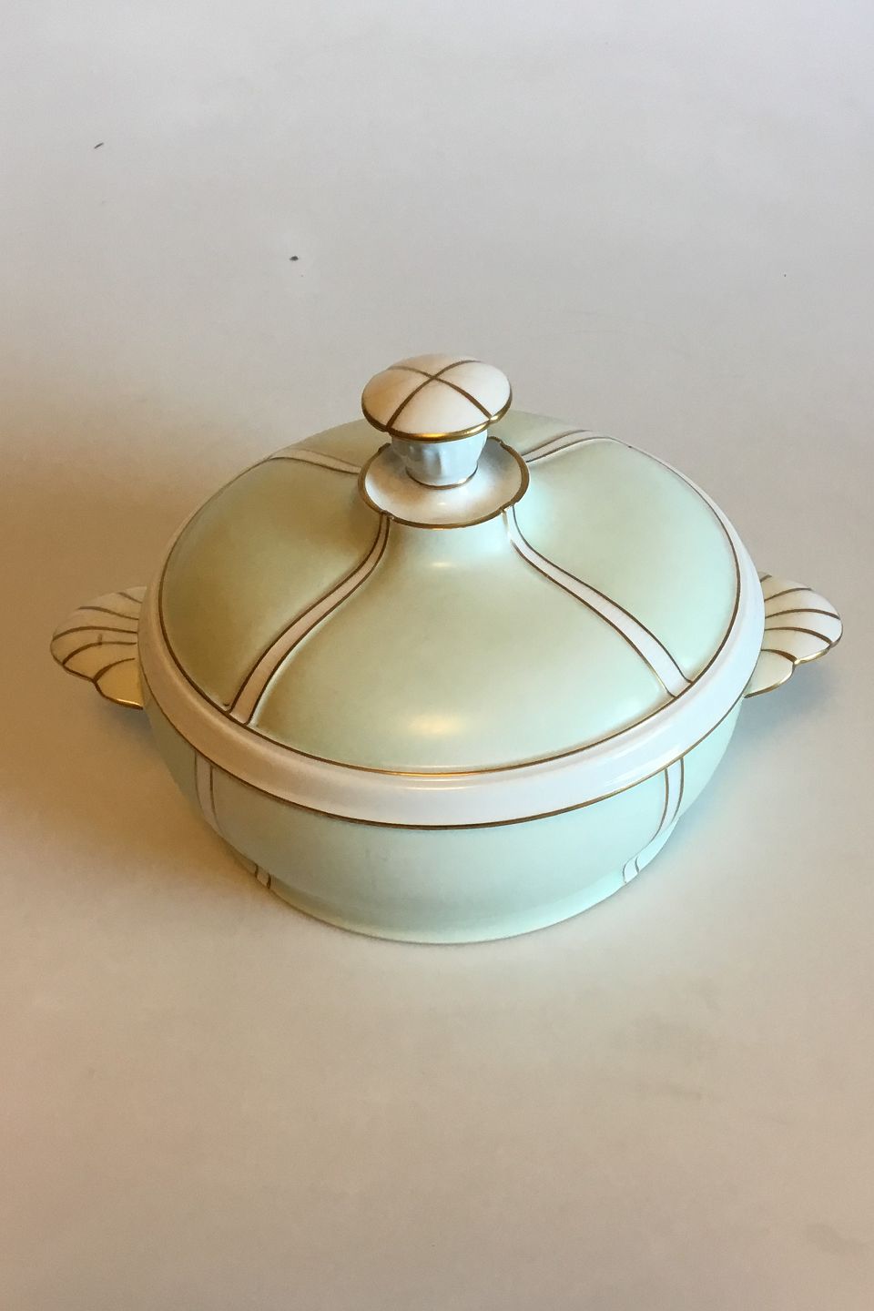 Bing & Grondahl Service with green decoration with gold on form 507(Herregaard) Round Tureen with Lid. Measures 21 cm / 8 17/64 in. dia. x 15.5 cm / 6 7/64 in.