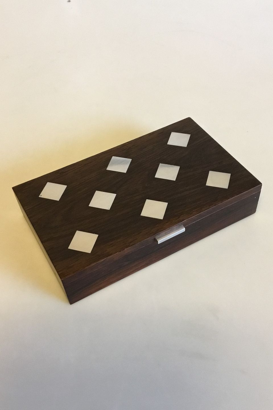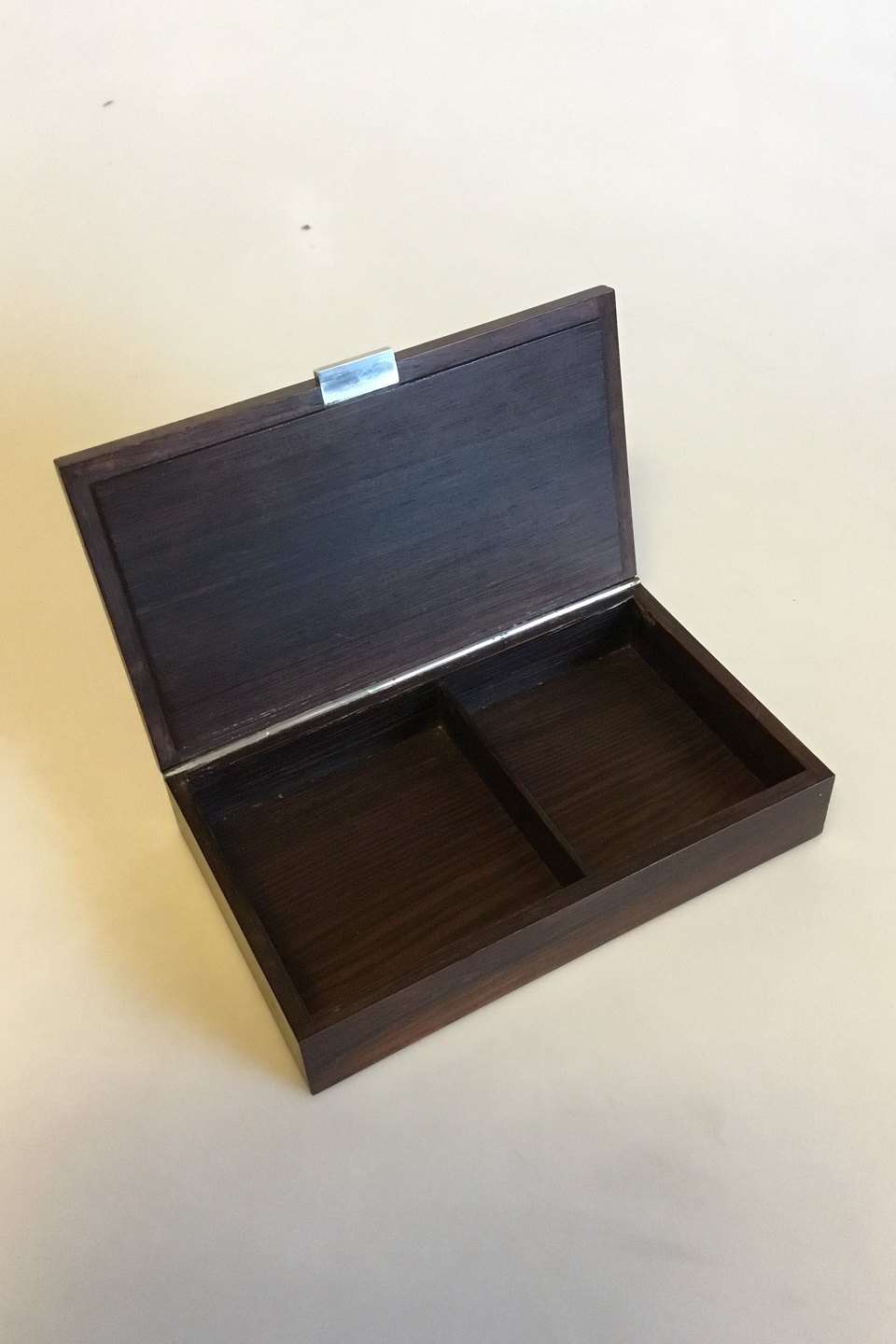 Hans Hansen Box of Rosewood with hinged Lid and Silver inlay. Measures 18 cm / 7 3/32 in. x 11 cm / 4 21/64 in. x 3.6 cm / 1 27/64 in.
