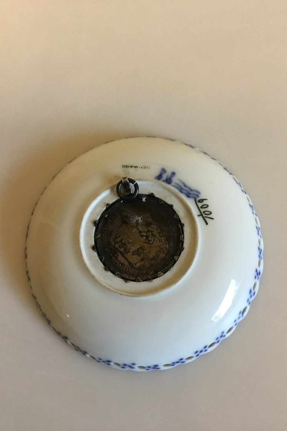 Royal Copenhagen Blue Fluted Full Lace Candle Drip Cup with 2-Crown coin with Frederik VIII, 1912. No 1009. Measures 9.4 cm / 3 45/64 in.