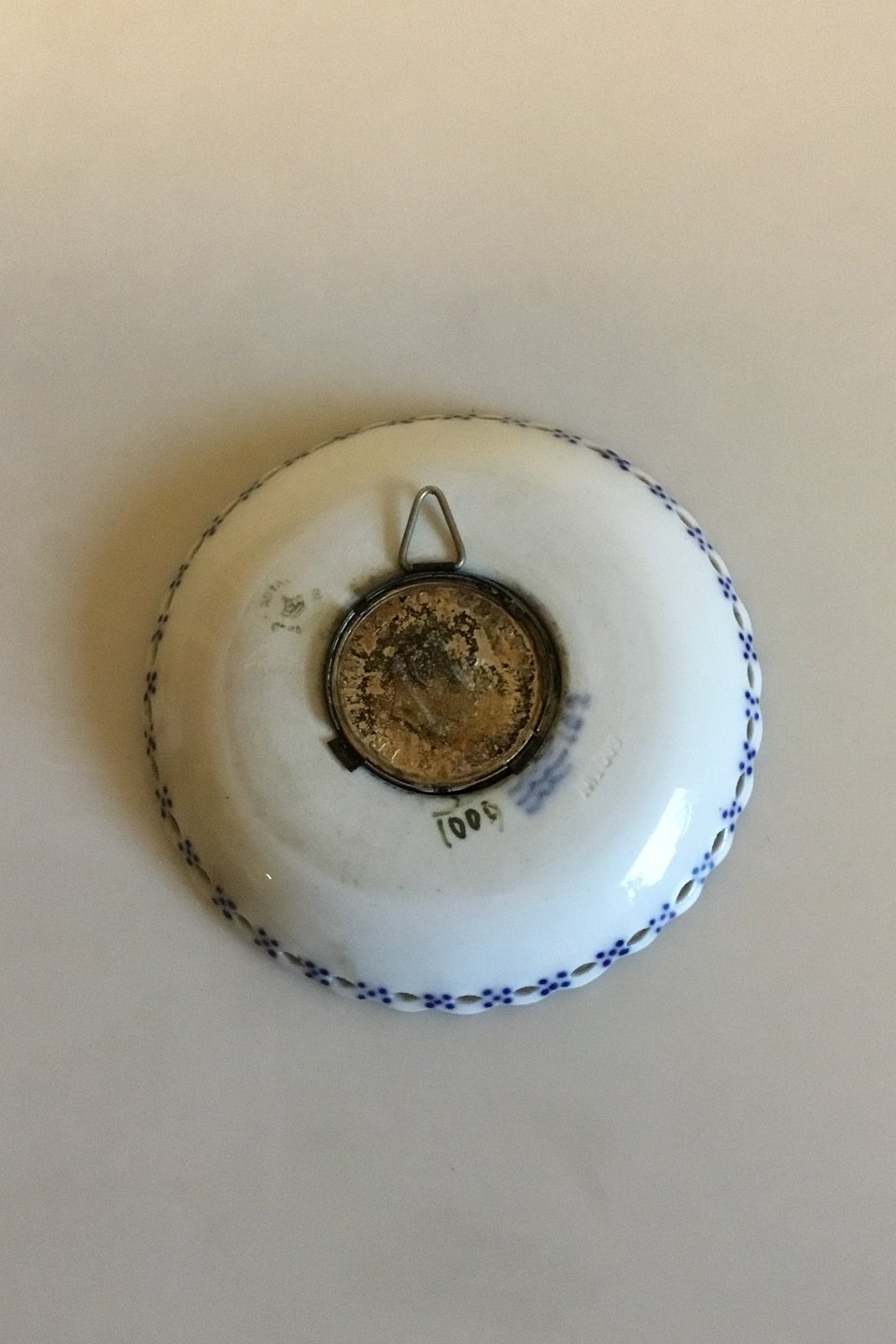 Royal Copenhagen Blue Fluted Full Lace Candle Drip Cup with 2-Crown coin with Princess Margrethe, 1958. No 1009. Measures 9.4 cm / 3 45/64 in.