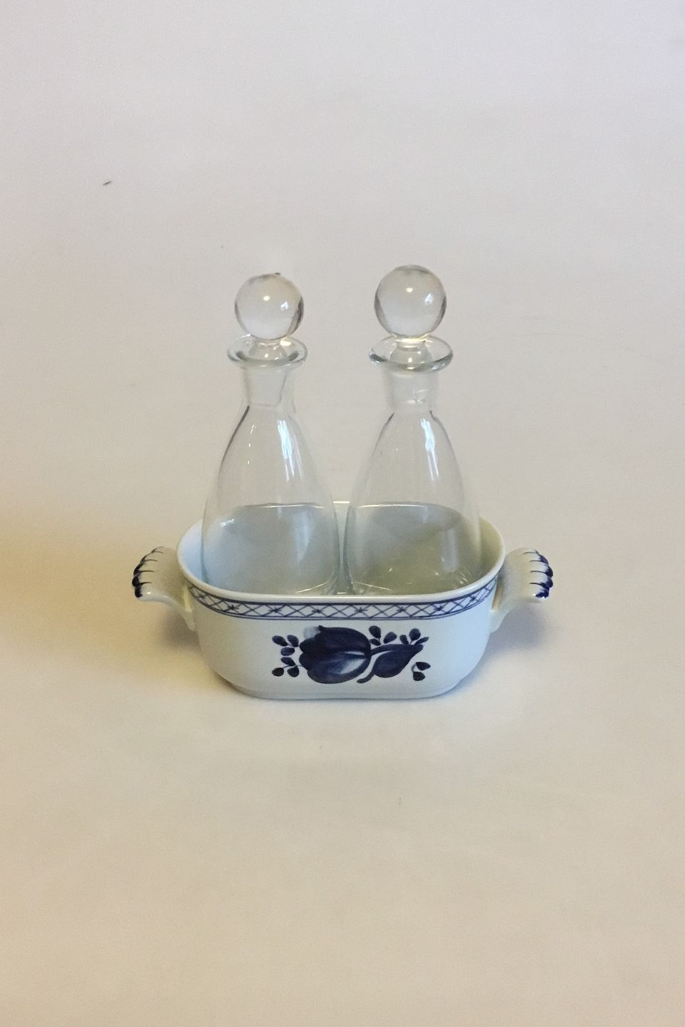 Royal Copenhagen Blue Tranquebar Oil-Vinegar Set No 1804. Measures 14 cm / 5 33/64 in. x 15.5 cm / 6 7/64 in.