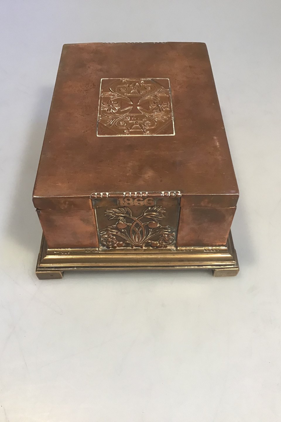 Johan Rohde for Georg Jensen. Cigarbox of copper and brass, wood linind. Decorated with art noveau motifs and DFDS 1866-1916. Inside plaque: Til Minde Om Det Forenede Dampskibsselskabs 50 Aarige Stiftelsesdag.(In commemoration of United Steam Ships 50th inauguration) H. 8,5 W. 19 D. 14. cm.(H 3.34" W 7.48" D 5.51")