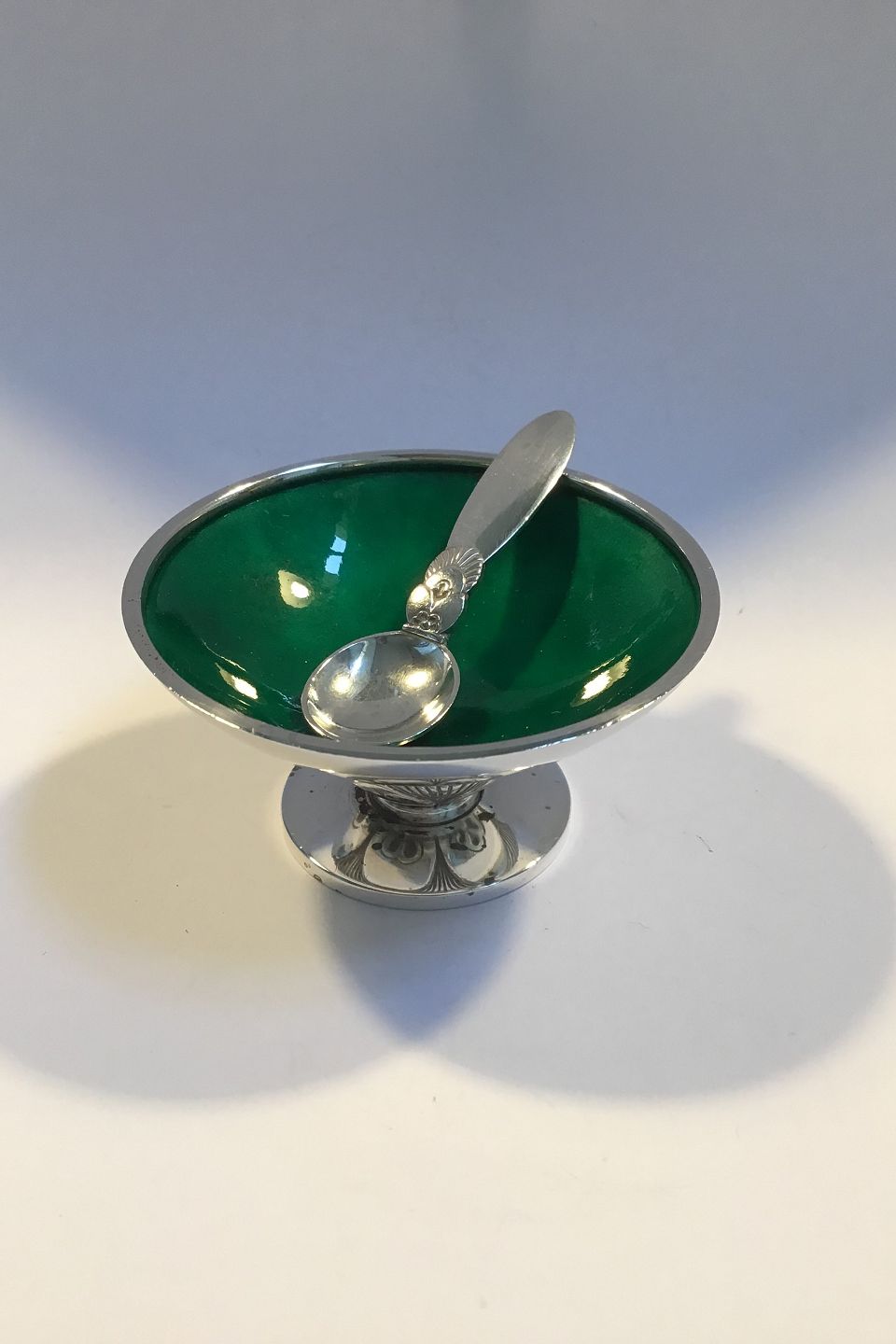 Georg Jensen Sterling Silver Cactus Salt Cellar(Green enamel) No 629 A and Salt Spoon Diam 6 cm/2.36" H 3.2 cm/1.25" Combined Weight approx 50 gr/1.80 zo