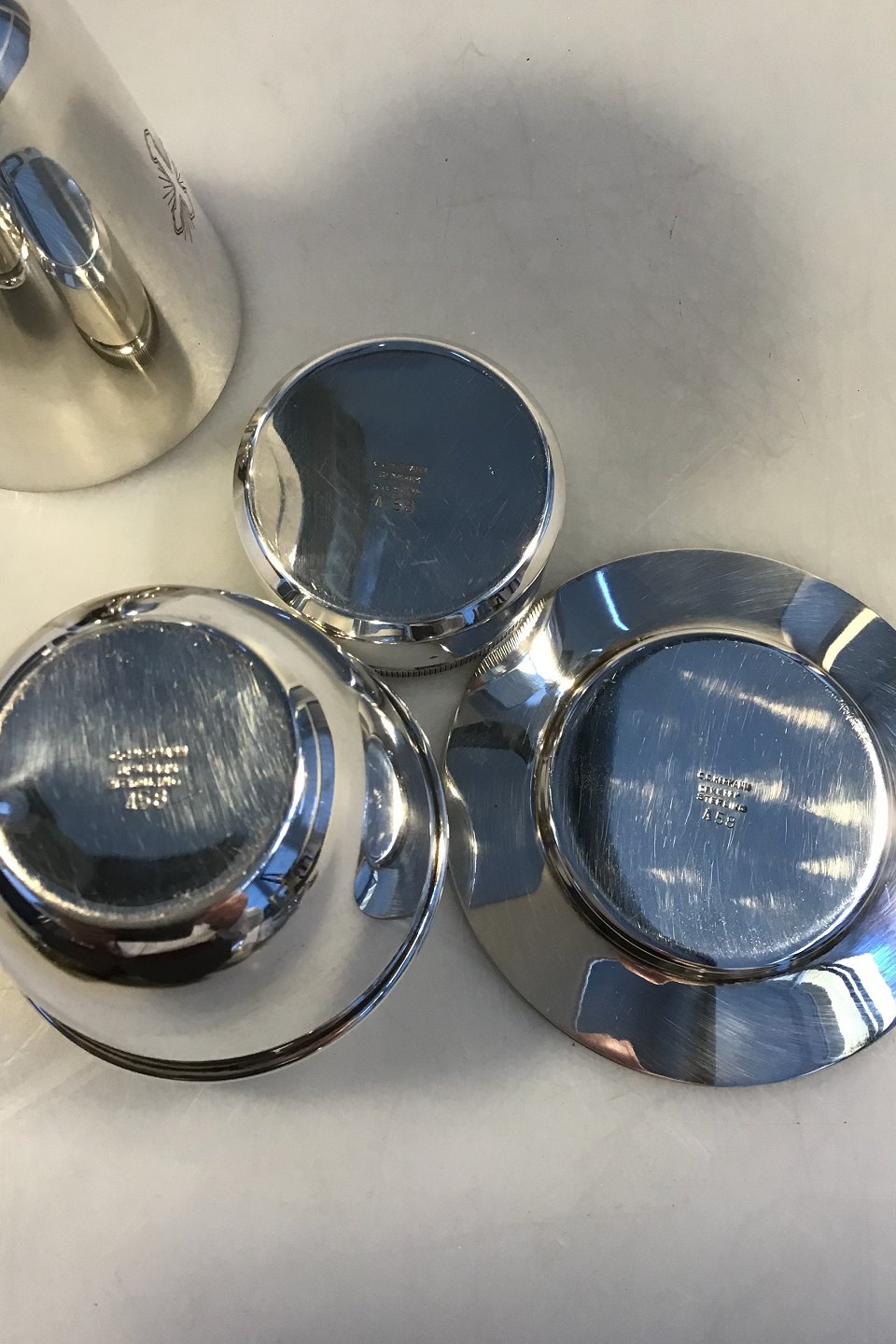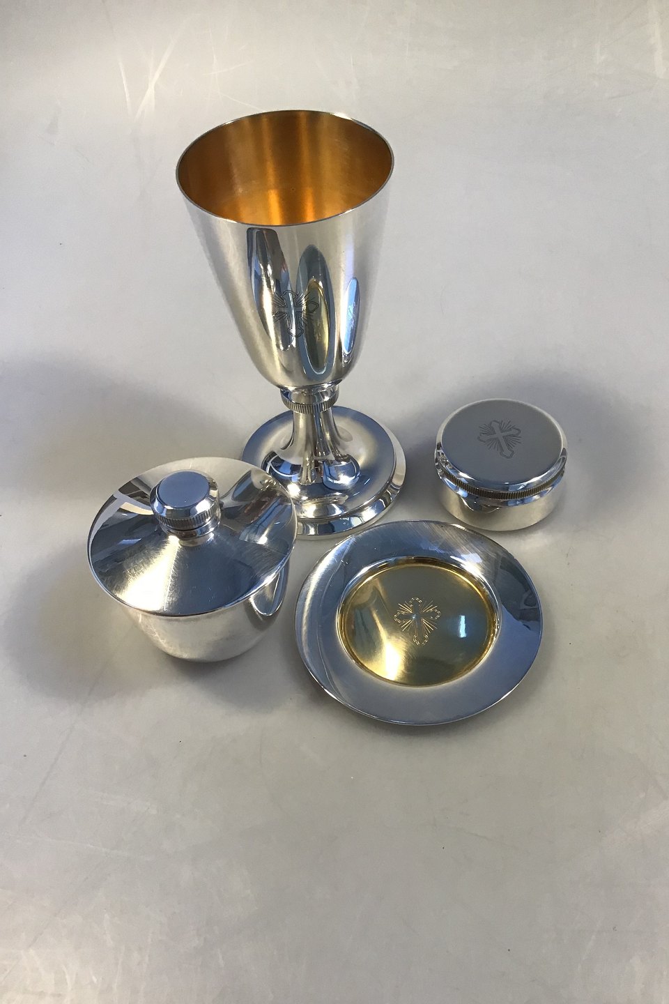 C.C. Hermann Tranportable Sterling Silver Altar Set comprising chalice, container, hostie box and -dish. Partially gilded. In fitted case. H. 18 cm./7.08" Diam. 9 cm./3.54" Weight 360 gr. /12.69 oz