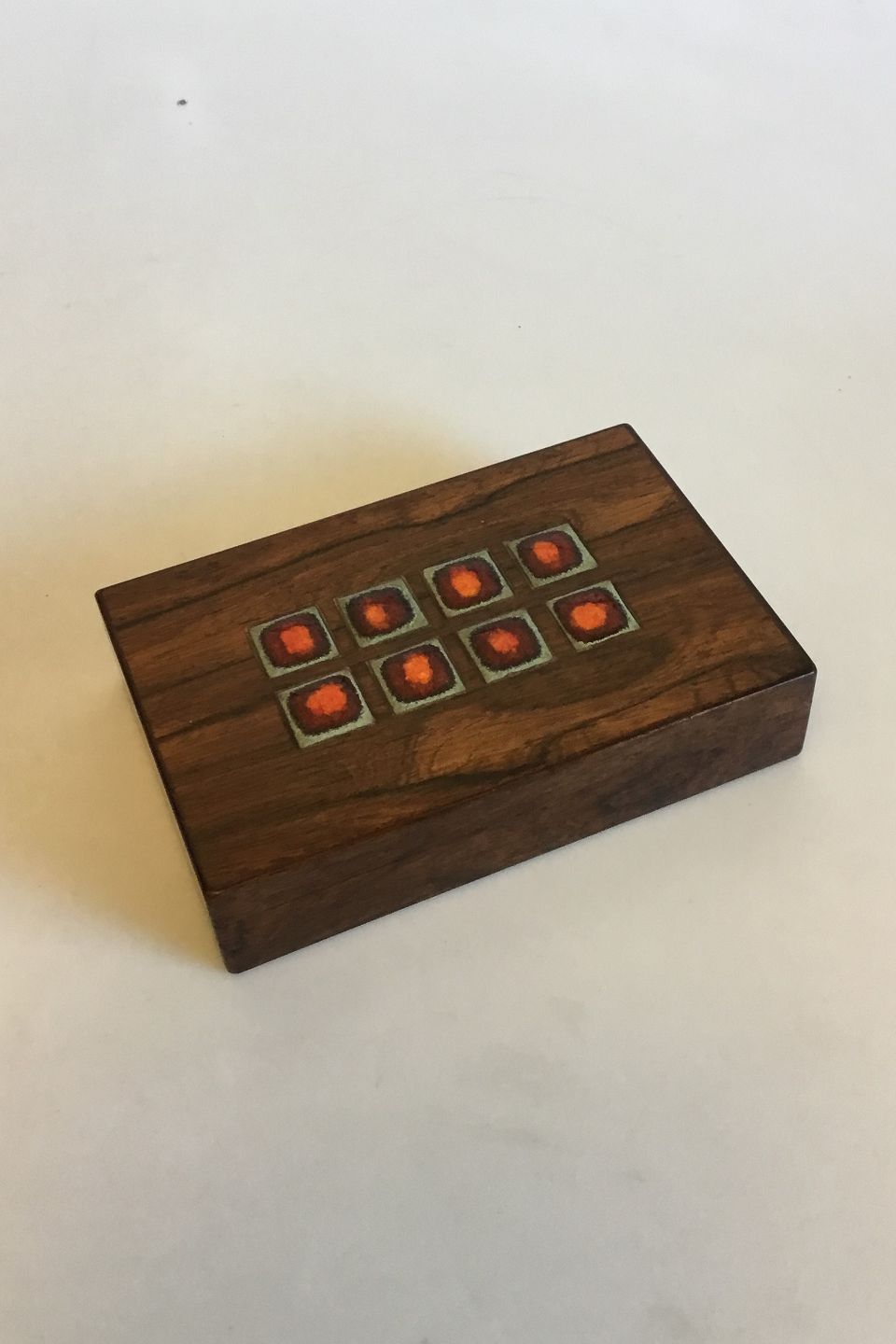 Klitgaard Box of Rosewood with Enamel med Bodil Eje. Measures 19.2 cm / 7 9/16 in. x 12.8 cm / 5 3/64 in. x 4.3 cm / 1 11/16 in.