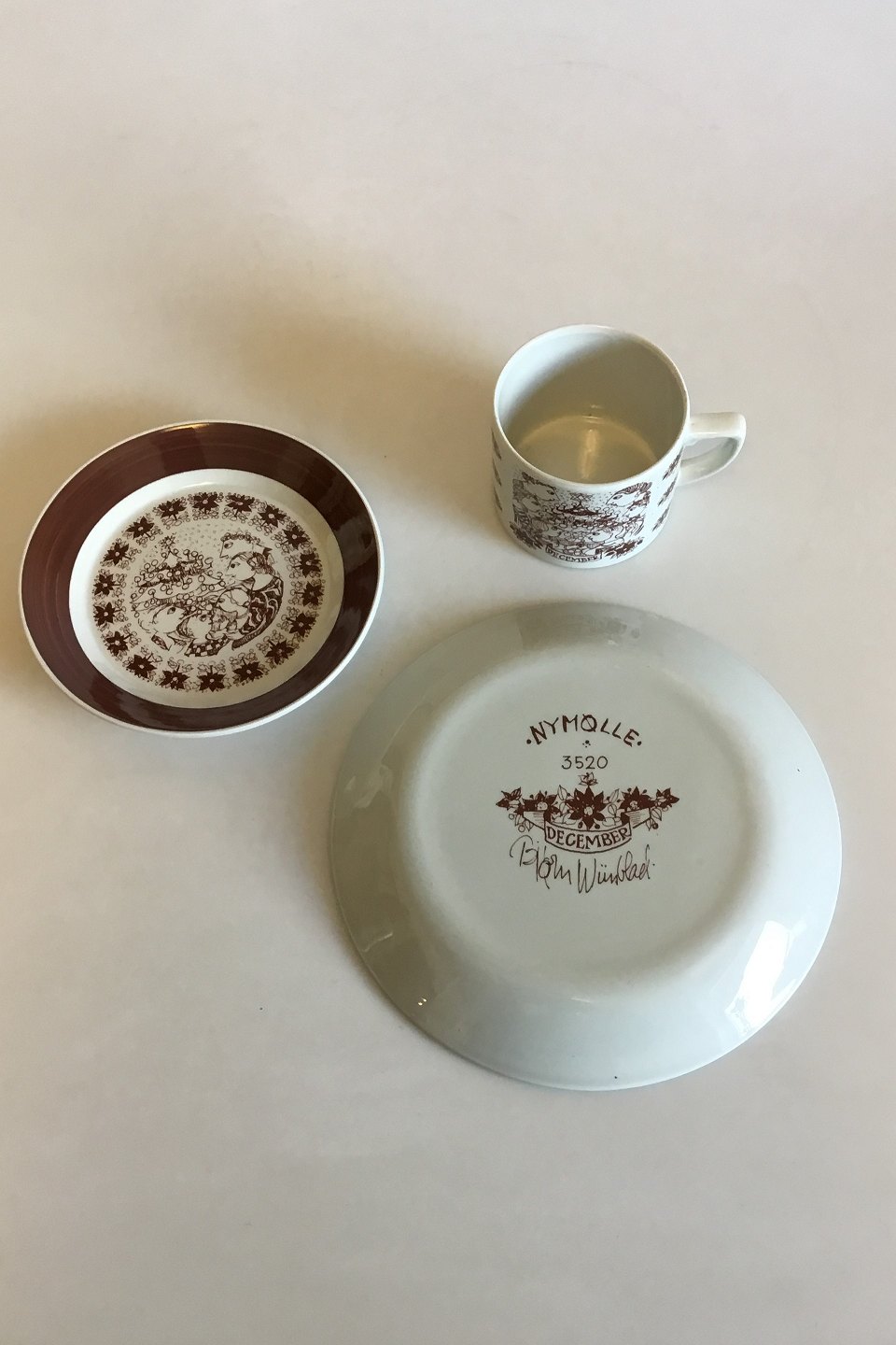 Bjorn Wiinblad, Nymolle December Month Cup No 3513, Saucer and Cake Plate No 3520. Measures Cup: 7 cm / 2 3/4 in. x 8 cm / 3 5/32 in. dia. Saucer: 15 cm / 5 29/32 in. Cake Plate: 20 cm / 7 7/8 in.