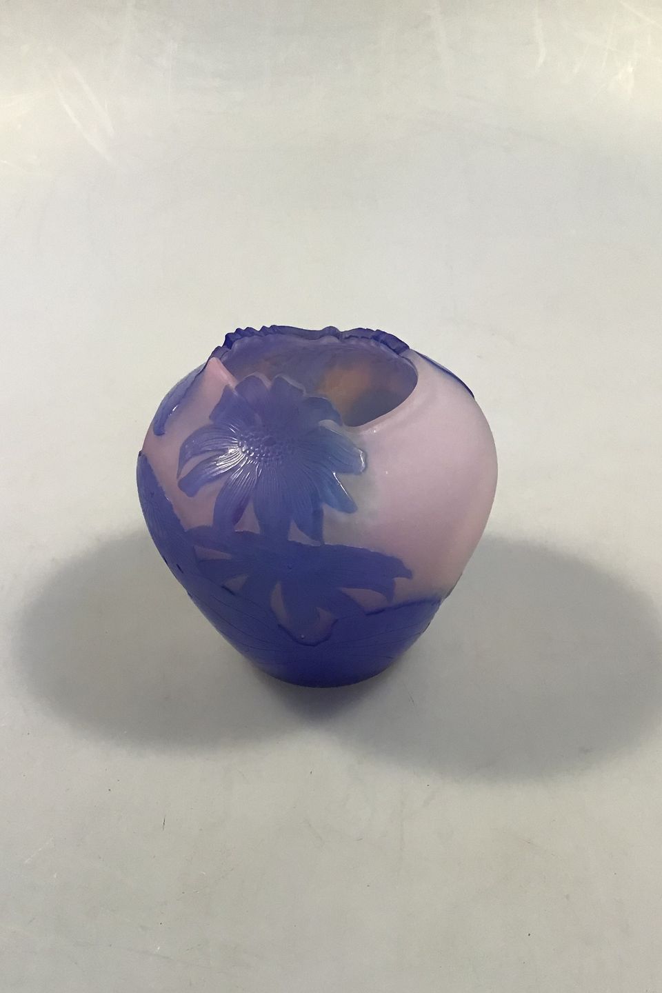 Emile Gallé: Vase of rose frosted glass, overlaid with bluish purple glass carved with flowers and leaves. H. 9 cm(3.54in)