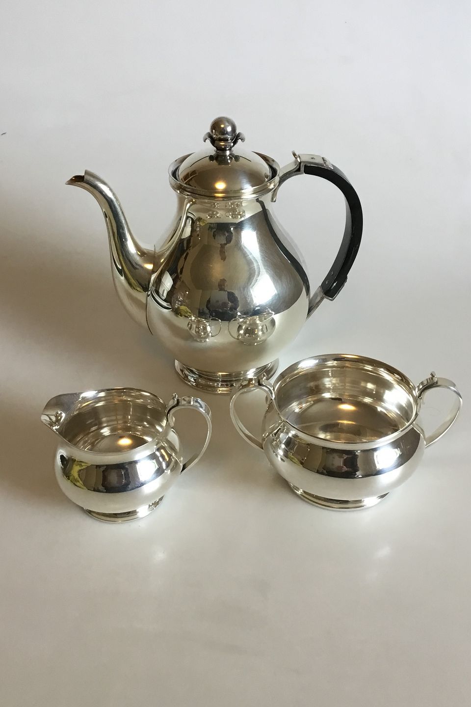 Cohr Silver plated Coffee Service. Measures: Coffee Pot 18 cm / 7 3/32 in. Sugar Bowl 7 cm / 2 3/4 in. Creamer 7 cm / 2 3/4 in.