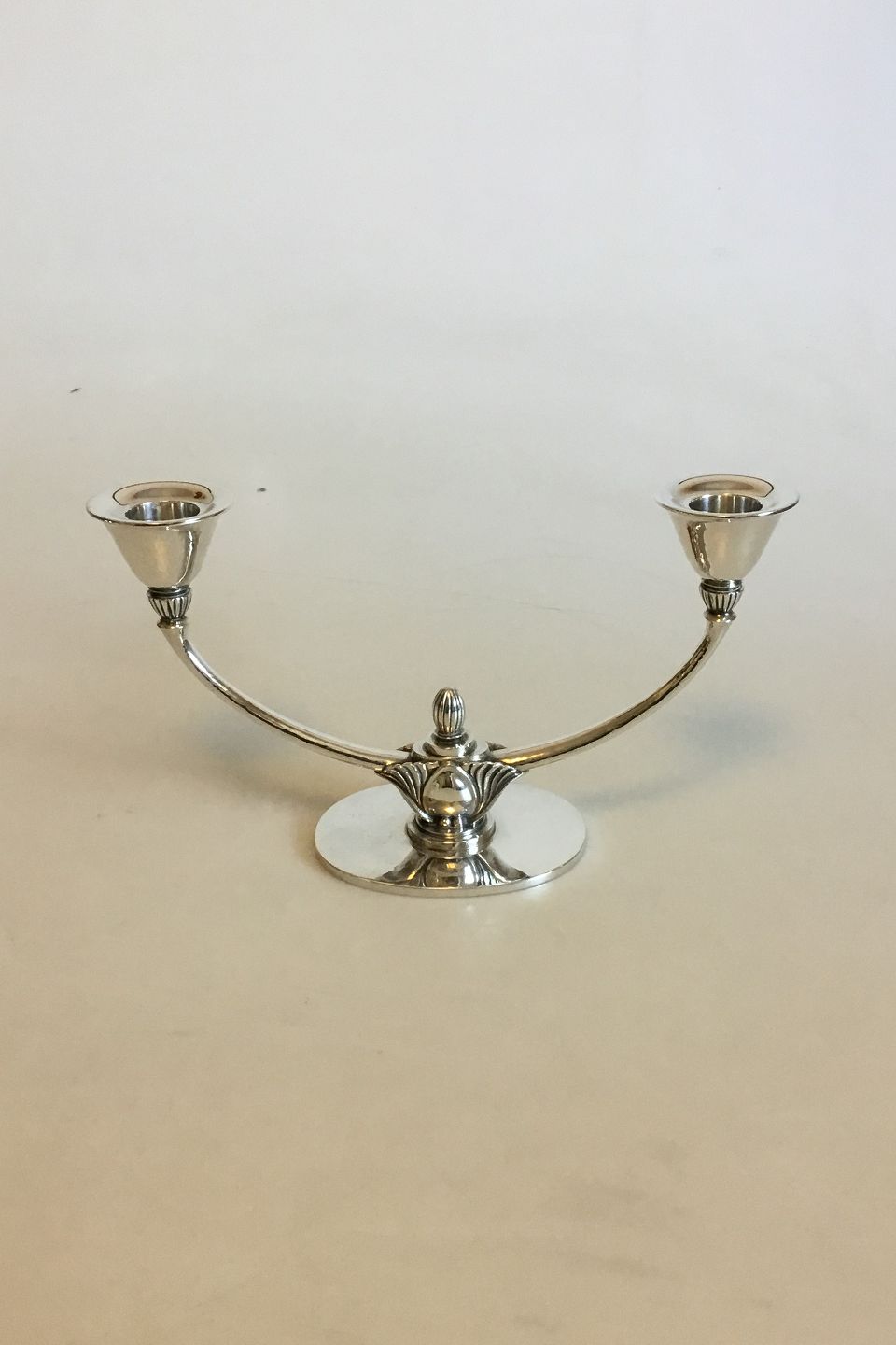 Georg Jensen Sterling Silver Two-Branch Candlestick No 673A. Measures 22 cm / 8 21/32 in. x 12.5 cm / 4 59/64 in. Weighs 420 g / 14.85 oz.