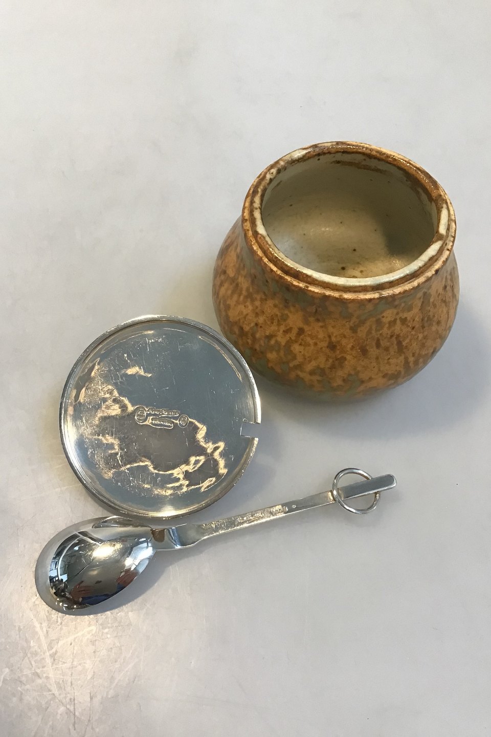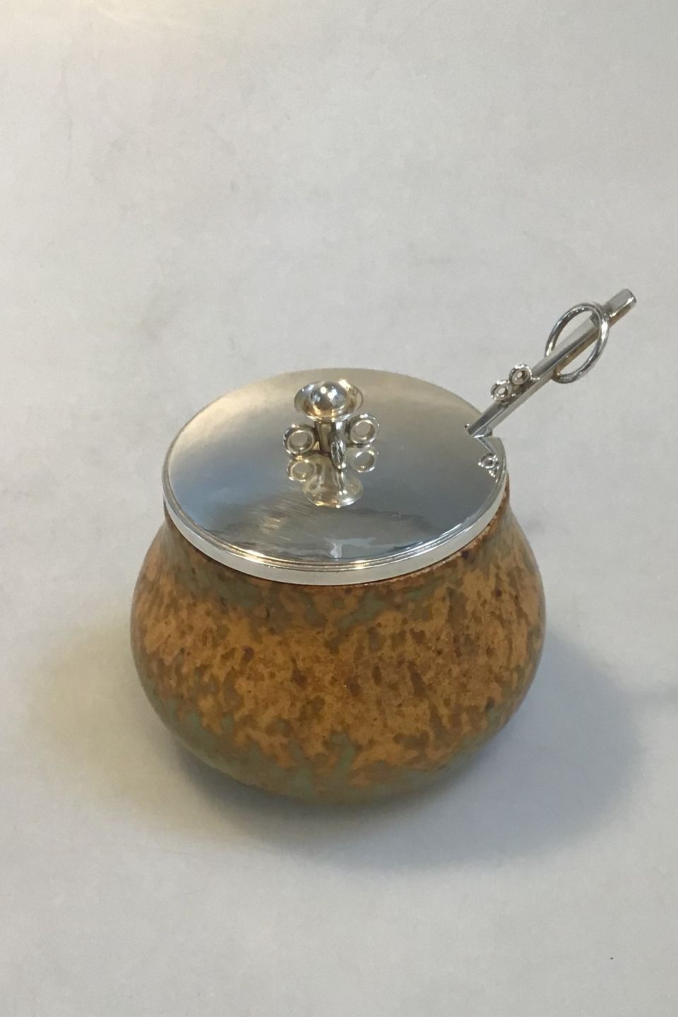 Bode Willumsen Hans Hansen Jam Jar Sterling Silver Lid and Spoon Jam Jar made of stoneware decorated with bird egg glaze in golden shades. Underneath sign. Bode Willumsens and Hans Hansens monogram 1938, lid and spoon of Sterling Silver made at Hans Hansen af Karl Gustav Hansen, lid hallmarked 1939. H. 8,5 cm.(3.34 in) incl. finial, Diam 10 cm(3.93 in) Inside with hairline