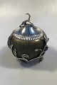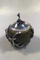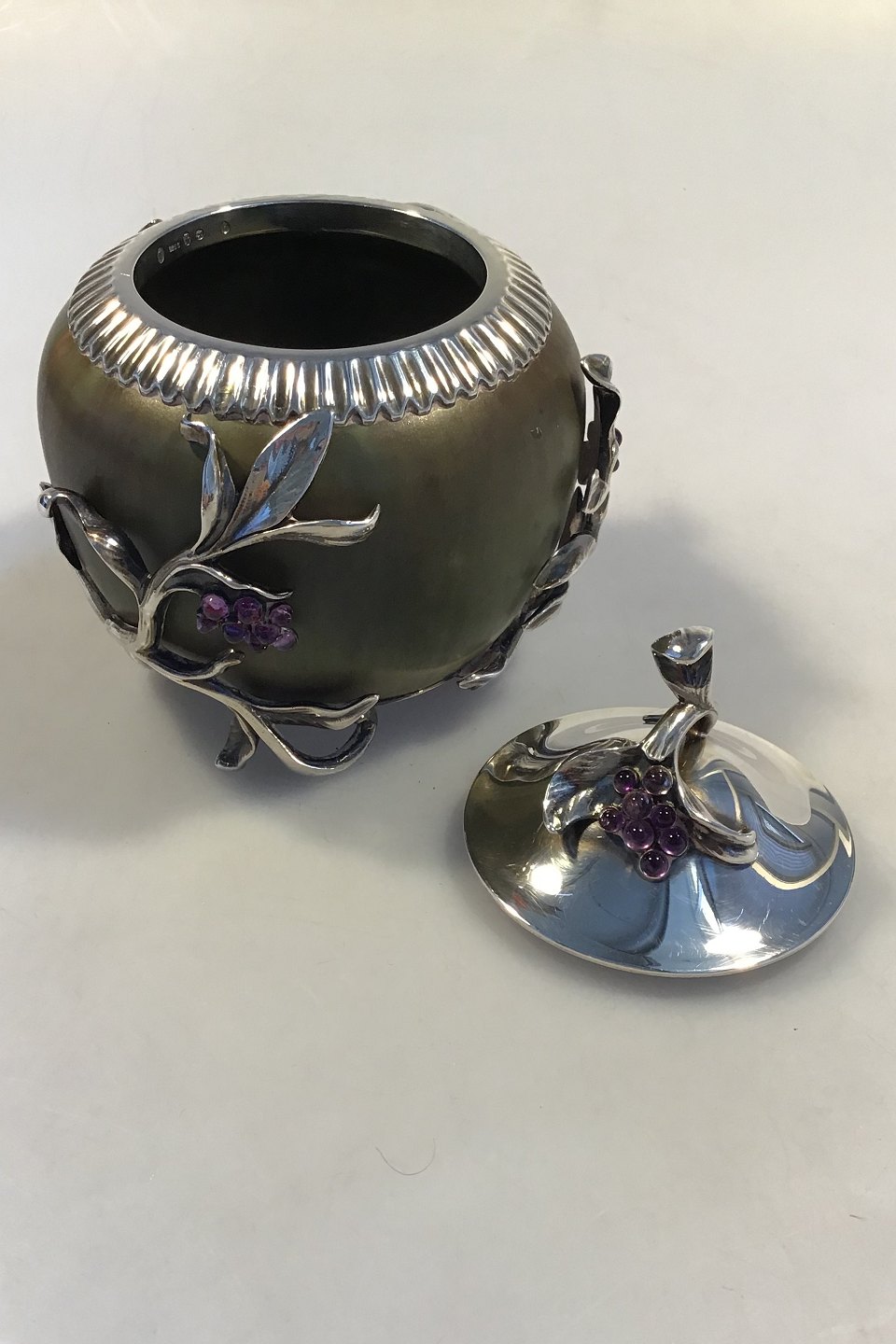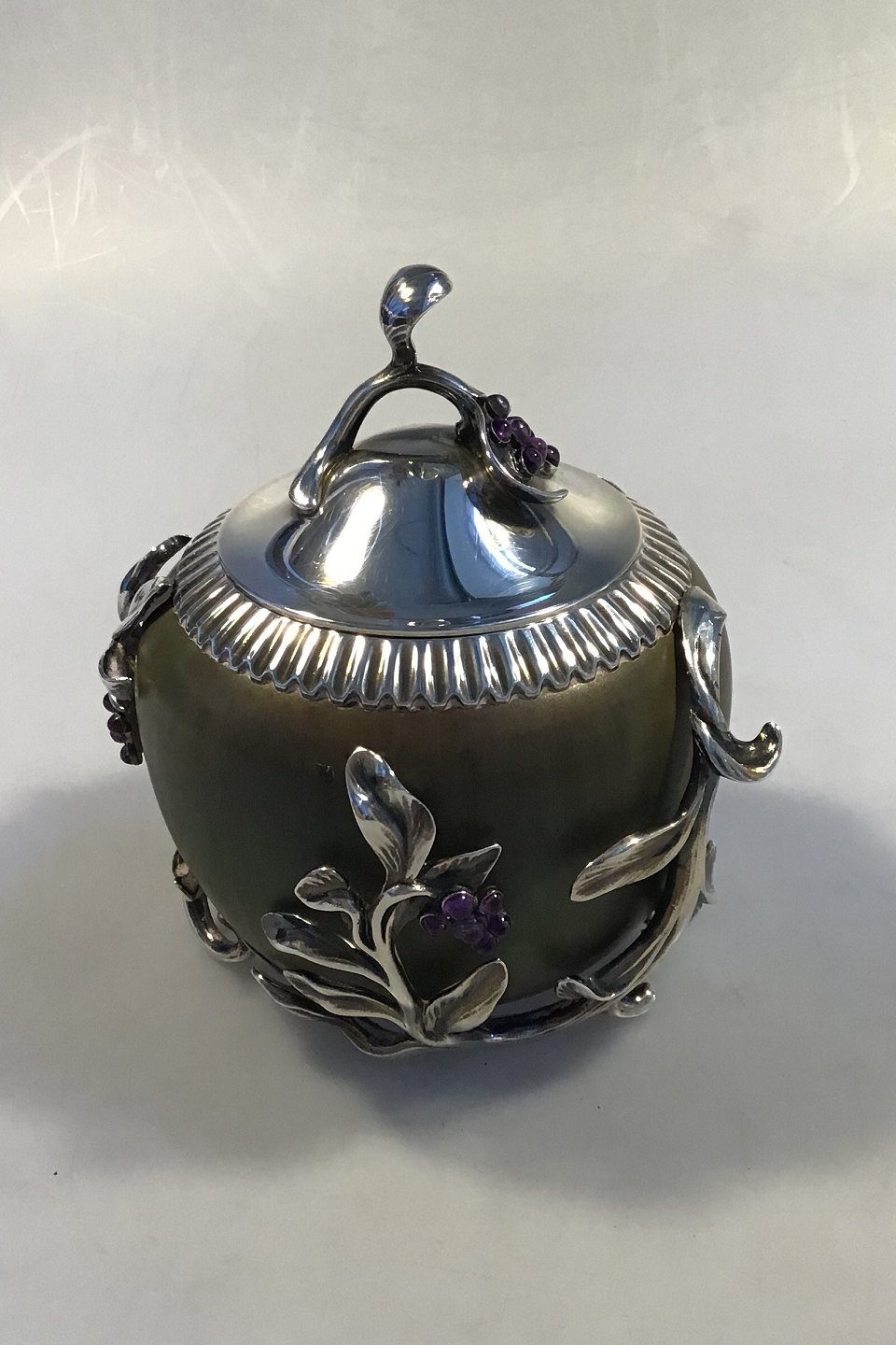 Royal Copenhagen. Jar in stoneware with green Sung glaze, Anton Michelsen mounting with lid in sterling silver with leaves and grape bunches of a total of 30 amethysts. Signed PN, with three waves and dated 5/12 1919. Silver mounting hallmarked Michelsen, 1920, ER, 925S, assay master Carl Frederik Heise. H. incl lid 14.5 cm(5.70 in). Diam 12 cm. (4,72 in)